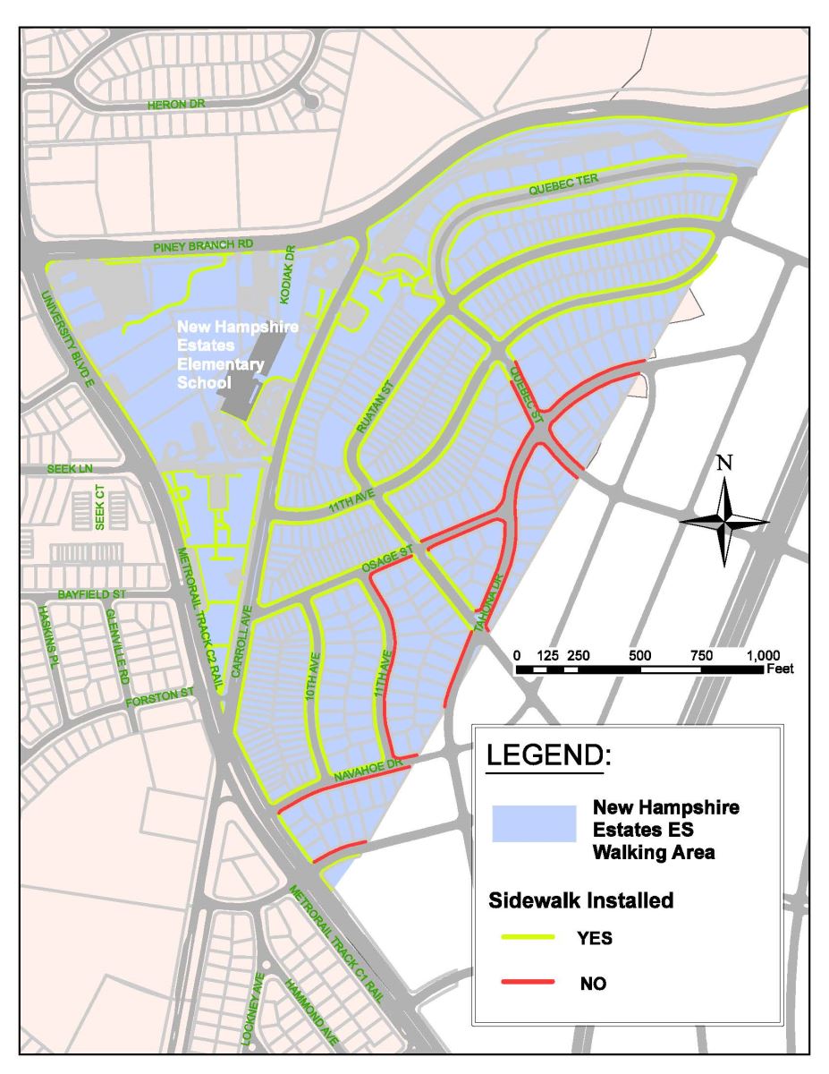 Montgomery County Department of Transportation (MCDOT) conducted a community meeting on October 25, 2023, to present findings from our Safe Routes to School Walkability Study for the New Hampshire Estates Elementary School community. Short term safety improvements identified in the Walkability Study have been implemented, and longer-term improvements have been identified and concept designs are in development. A Community Meeting is scheduled for June 4, 2024, to present these designs and safety improvements and discuss with residents.