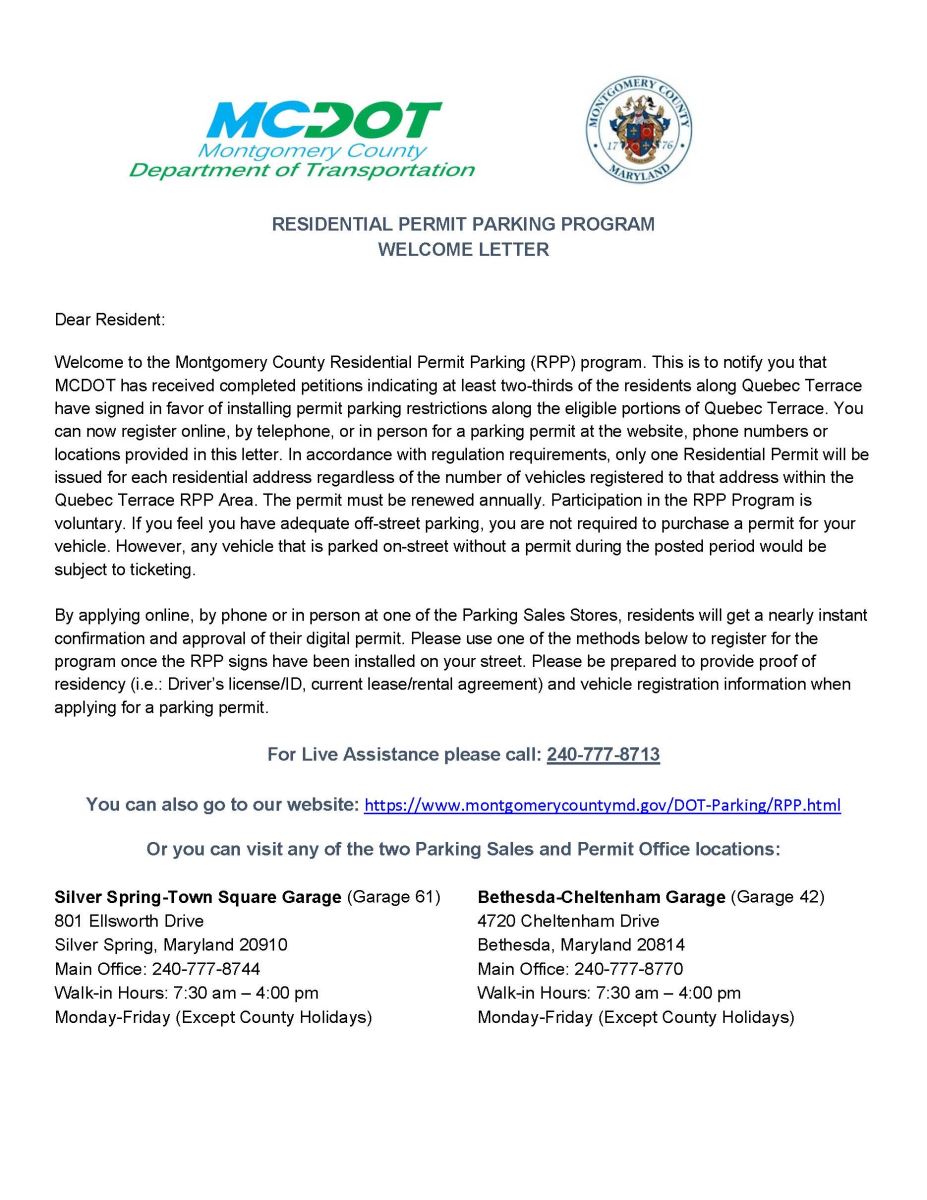 Residents of a Participant Block may request a petition from MCDOT by sending a written request to [email protected]. This written request should indicate a specific street name and the two streets that intersect on either side of the block. Each request should include a brief description of the parking problems being experienced along the block and indicate a specific permit parking restriction to be installed. For a permit parking restriction to be installed on a block, at least two-thirds of the households on that block must sign “in favor” of the restriction. Sample RPP Petition.