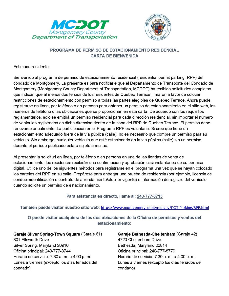 Los Residentes de una Cuadra Participante pueden solicitar una petición al Departamento de Transporte del Condado de Montgomery (MCDOT) enviando una solicitud escrita a [email protected]. Esta solicitud escrita debe indicar el nombre específico de una calle y las dos calles que se intersectan a cada lado de la cuadra. Cada solicitud debe incluir una breve descripción de los problemas de estacionamiento que hay en la cuadra e indicar una restricción específica de estacionamiento con permiso a instalar. Para que se pueda instalar una restricción de estacionamiento con permiso en una cuadra, al menos dos tercios de las viviendas en esa cuadra deben firmar “a favor” de la restricción. Muestra de la petición de RPP.
