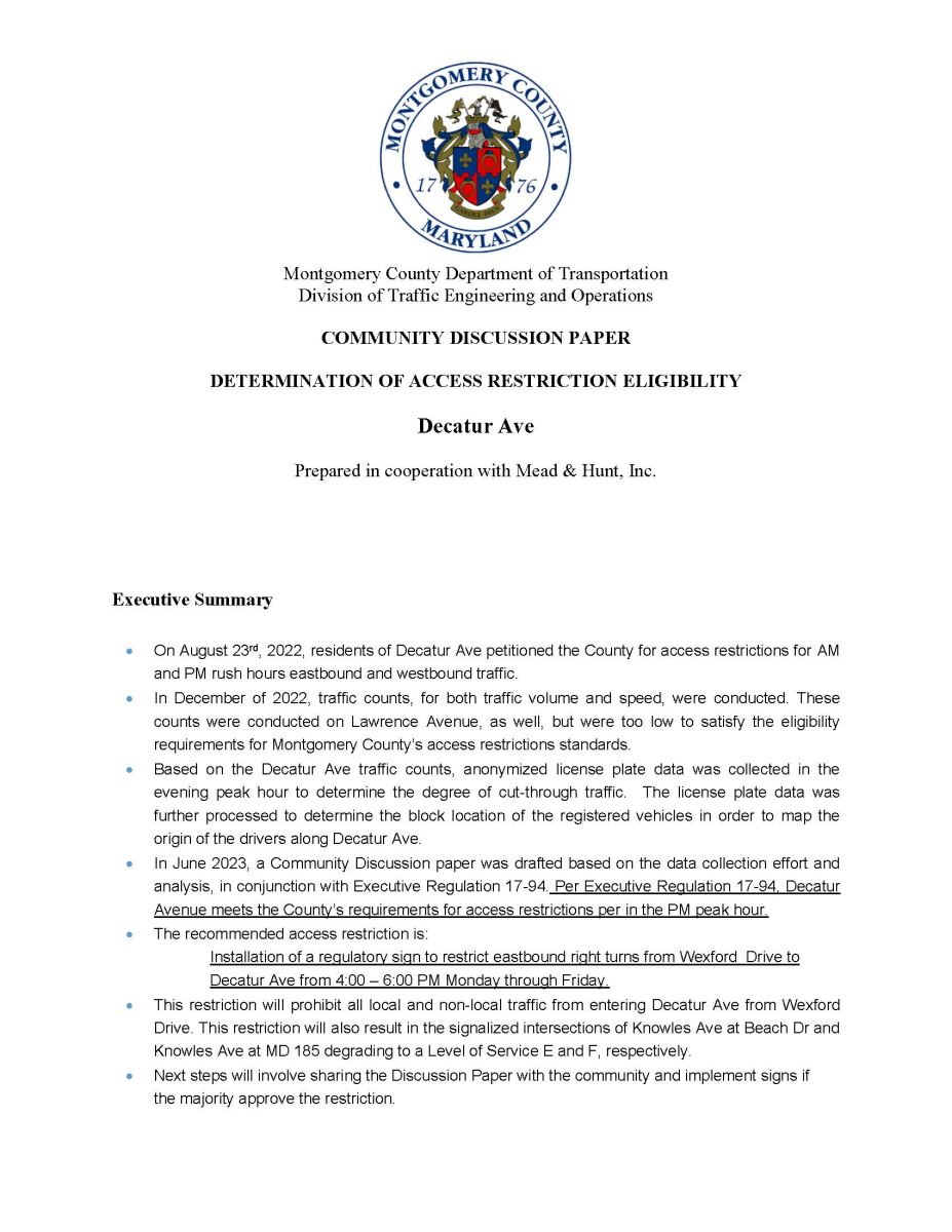 A virtual public hearing was held for the Decatur Avenue Access Restriction Under Consideration on March 13, 2024. The Record will remain open to written testimony and comments through Friday, April 12, 2024, at 6:00 p.m.