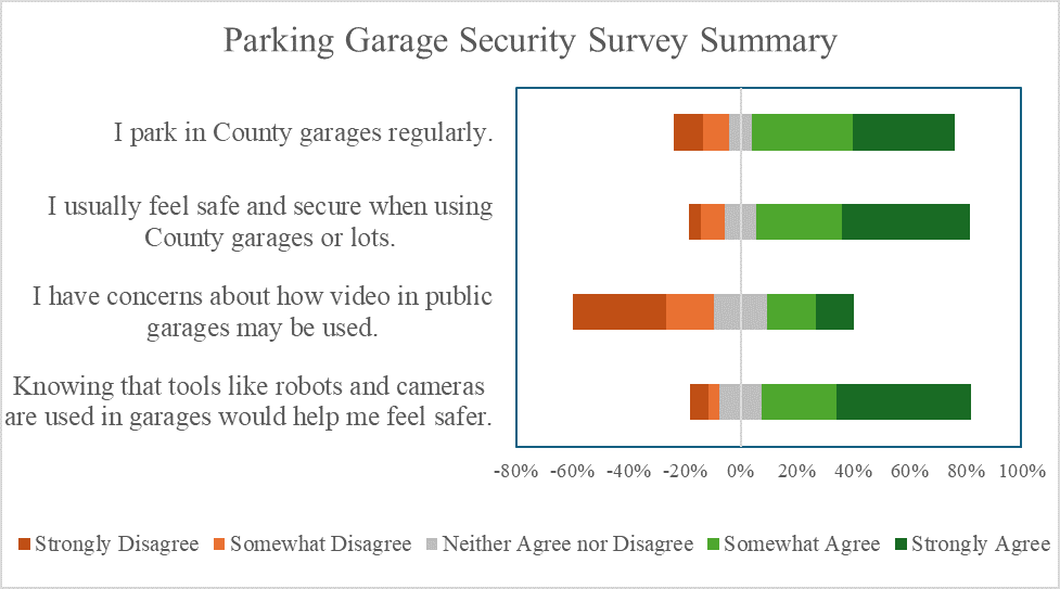 In August and September 2025, Montgomery County Department of Transportation (MCDOT) hosted a series of outreach events to provide information, answer questions, and gather feedback via electronic and paper surveys about a possible pilot program using a security robot in the Town Square Garage (Garage 61). Amharic and Spanish Translators were available as well as our MCDOT staff. The Survey received 347 responses with the following results.