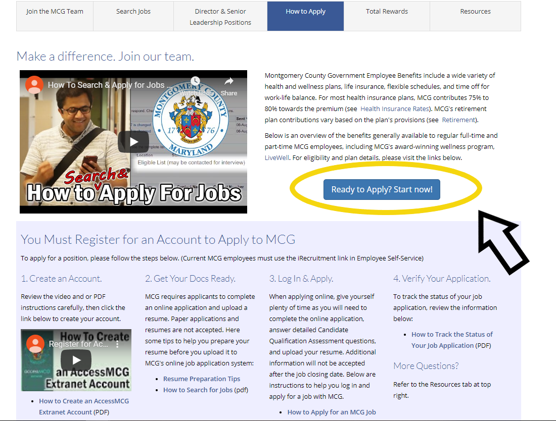If you need to register for an account to apply to MCG follow the directions on this page. After you have an account with MCG click on the "Ready to Apply? Start now!" button. This will take to the search jobs tab.