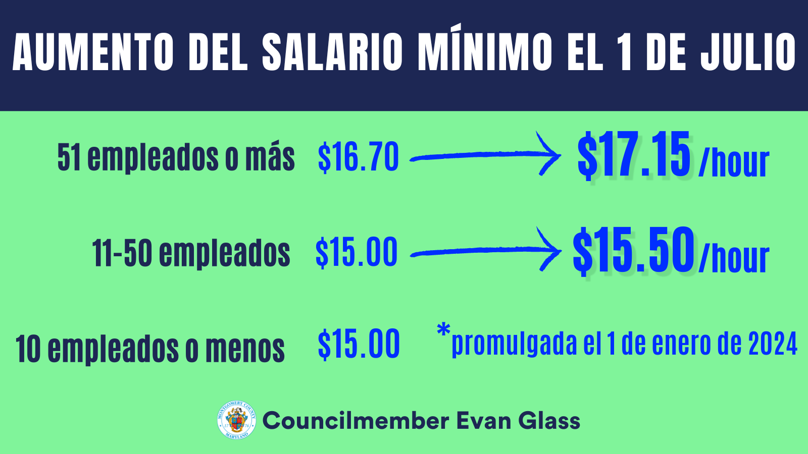 A partir del 1 de julio el nuevo salario mínimo será de $17.15 por hora para empleadores que tienen 51 o más empleados y $15.50 para empleadores que tienen de 11 a 50 empleados. Si queremos hacer que el Condado de Montgomery sea un lugar inclusivo en el que las familias vivan y trabajen, entonces debemos asegurarnos de que se lo puede permitir.