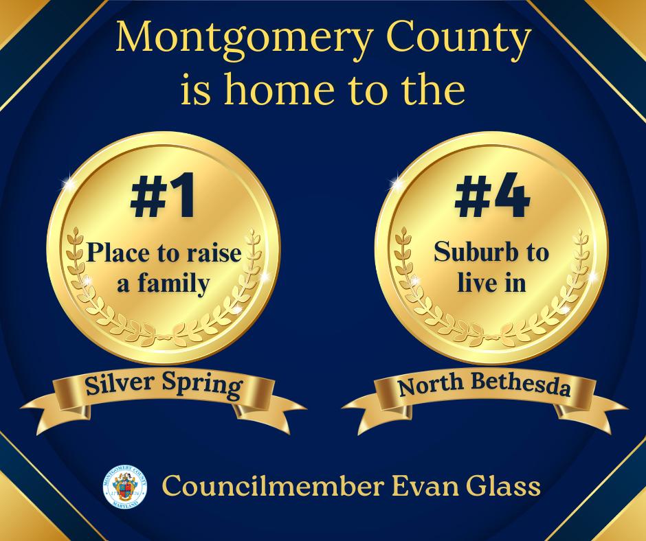 Silver Spring y North Bethesda fueron recientemente reconocidos como ¡dos de los mejores vecindarios en todo el país! La revista Travel + Leisure clasificó a North Bethesda como el #4 en su lista de los 10 mejores suburbios para vivir por sus “viviendas asequibles, escuelas de primera clase y excelentes oportunidades laborales” y Fortune clasificó a Silver Spring como el #1 en su lista anual de los mejores lugares para que vivan las familias. ¡Continuemos haciendo del Condado de Montgomery un lugar maravilloso para vivir, trabajar y tener una familia!