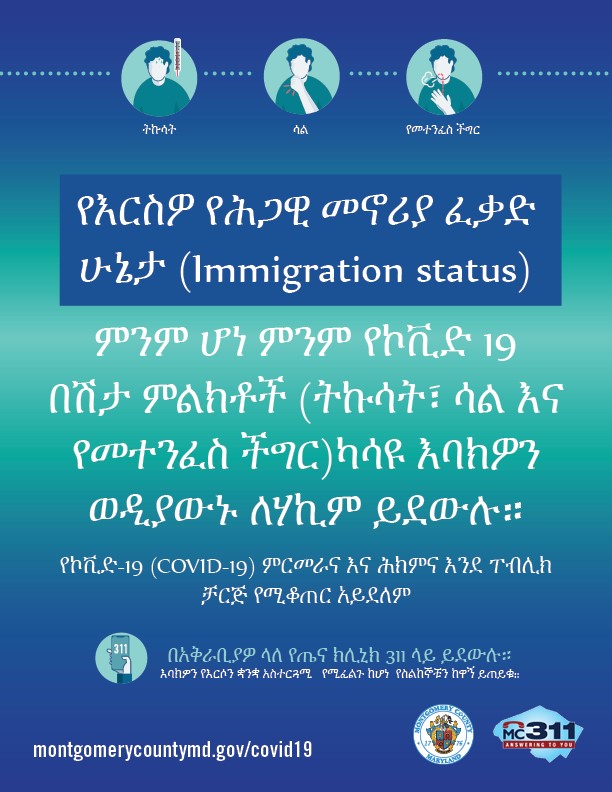 ስለ ኮቪድ-19 ምልክቶች እና ስለ ምርመራ አጠቃላይ መመሪያና ጥያቄዎች ካሉዎት ለ የኮቪድ-19 የጥሪ ማዕከል በስልክ 240-777-1755 ቁጥር ይደውሉ ፡፡ የጥሪ ማእከሉ በነርሶች የተሟላ ሲሆን በሳምንት ለሰባት ቀናት ከጠዋቱ 2- ምሽቱ 2 ሰዓት (8 ኤም-8 ፒኤም) ክፍት ነው::