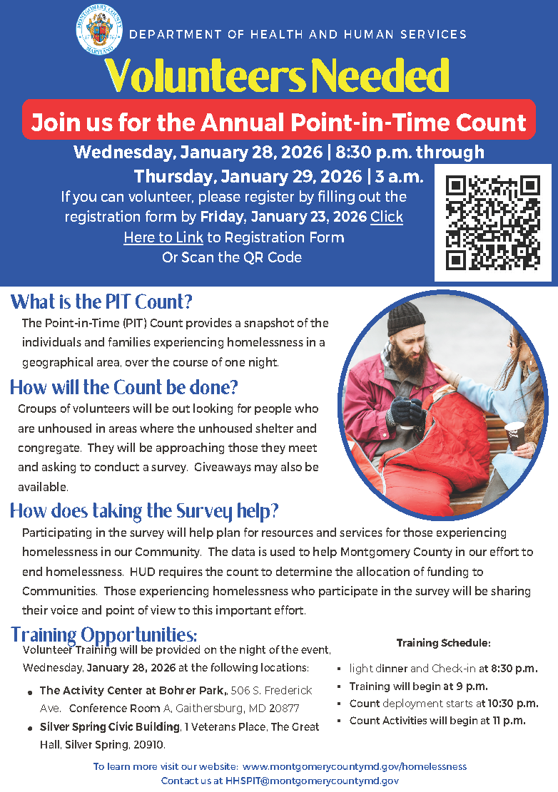 Join us for the Annual Point in Time Count scheduled Wednesday, January 28, 2026 at 8 p.m. through Thursday, January 29, 2026 to 3 a.m.