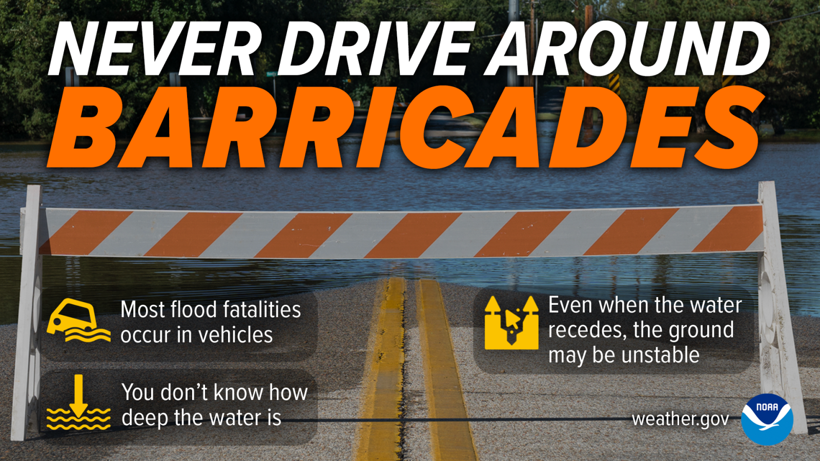 - Road beds may be washed out under flood waters. NEVER drive through flooded roadways. Turn Around Don't Drown®!