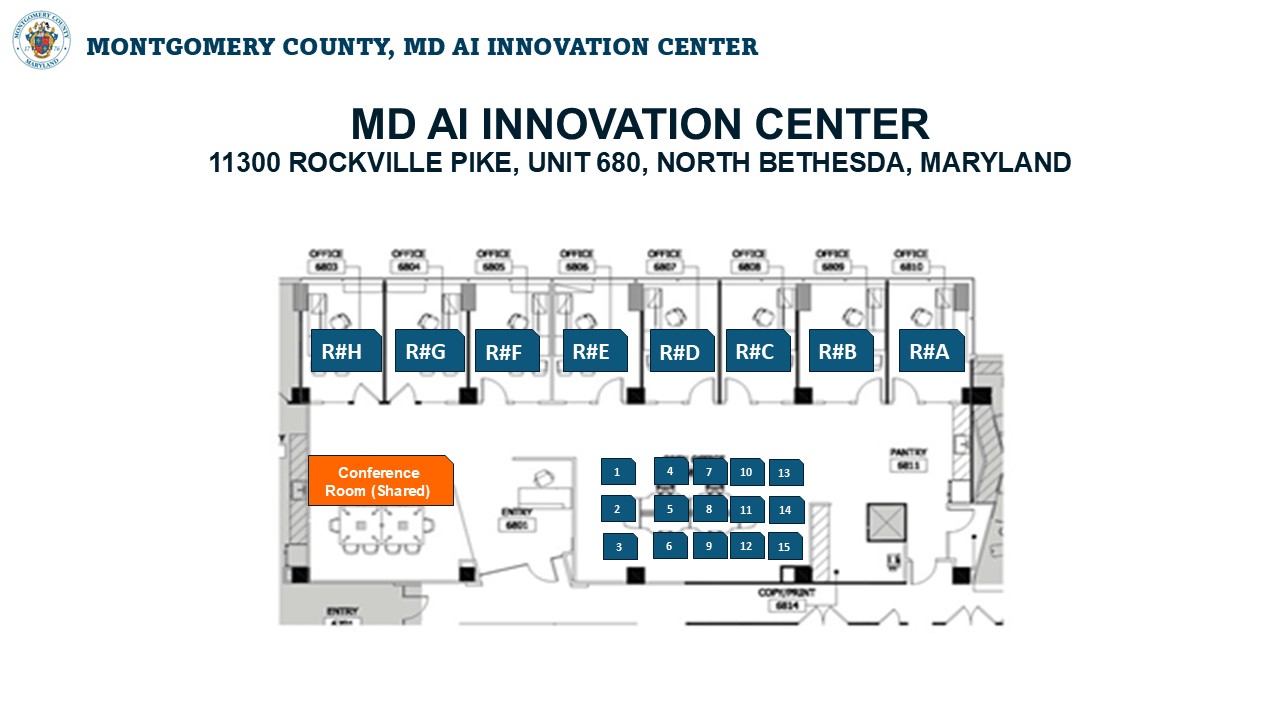The AI Innovation Center (AIIC) provides office space, coworking and meeting space for businesses incorporating AI their technology products and services. The Center is located minutes away from the University of Maryland’s Institute for Health Computing and conveniently near Rockville Pike, I-495 and Metrorail access to the many federal and private sector research and technology organizations nearby.