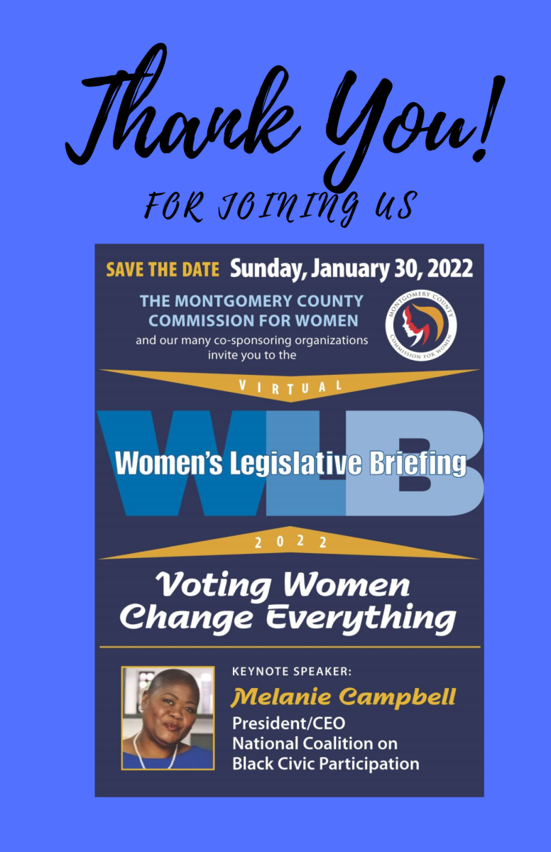 The Women’s Legislative Briefing (WLB) is the premier and longest-standing women’s legislative event in the state of Maryland. It is coordinated by the Montgomery County Commission for Women and brings together advocates, policymakers, and emerging leaders to empower, engage, and mobilize Marylanders around issues affecting women and girls throughout the state. The WLB inspires, promotes action, and helps bridge perspectives.