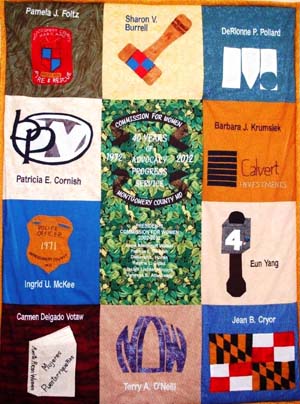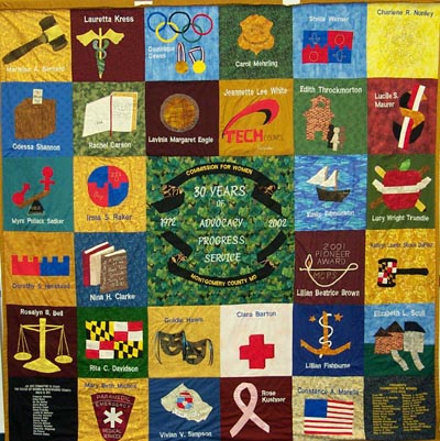 To commemorate its 30 years of service, advocacy and progress, in 2002 a quilt was created for the Montgomery County Commission for Women, featuring 30 women of historical significance to the county. The quilt is composed of 33 squares. Surrounding the central square, a composition commemorating the 30 years of the Commission, thirty two squares are placed. One square commemorates each of the thirty women. In the bottom corners, two squares name the members of the Ad Hoc Committee that recommended the establishment of the Commission for Women in 1972, and the presidents of the Commission from 1972 to 2002. In 2012, to mark the 40th anniversary of the Commission, another quilt was created featuring 10 more women of historical significance to the county. Their biographies have been added to this web site's "Women's History Archives."