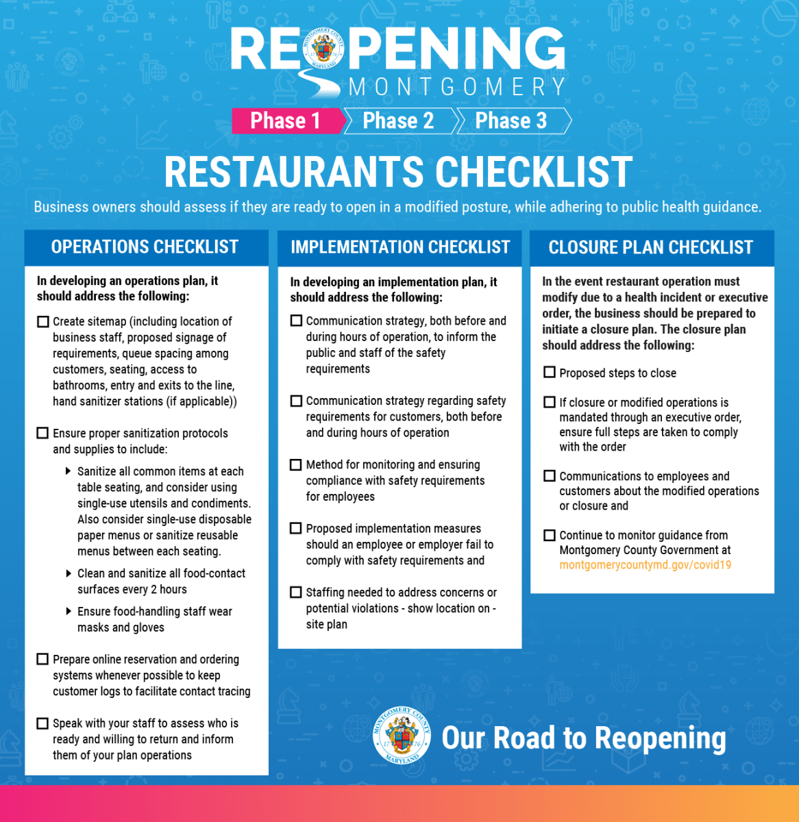- Review Montgomery County’s Reopening Restaurants Checklist and follow the recommendations.