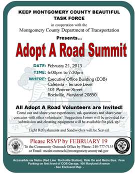 The Summit started promptly at 6:00pm on February 21st, 2013, at the Executive Office Building at 101 Monroe Street in Rockville. Art Holmes, MCDOT Director, gave opening remarks, followed by Tom Pogue, MCDOT Community Relations Manager. The Summit gave each volunteer a chance to learn about County support for the Adopt A Road program, share their experiences, knowledge and concerns with other volunteers, and to pick up cleaning equipment.