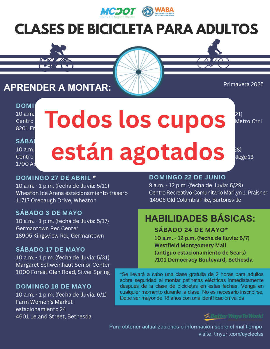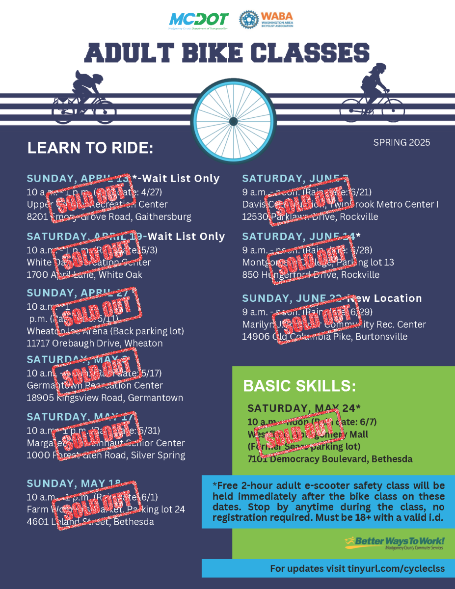 The Fall 2025 Adult Bike and Scooter classes have wrapped up. Stay tuned here or follow us on social media at @MCDOTNow on Twitter, Instagram, Facebook, Bluesky, and Threads for updates on the Spring 2026 season starting in February. Happy riding!