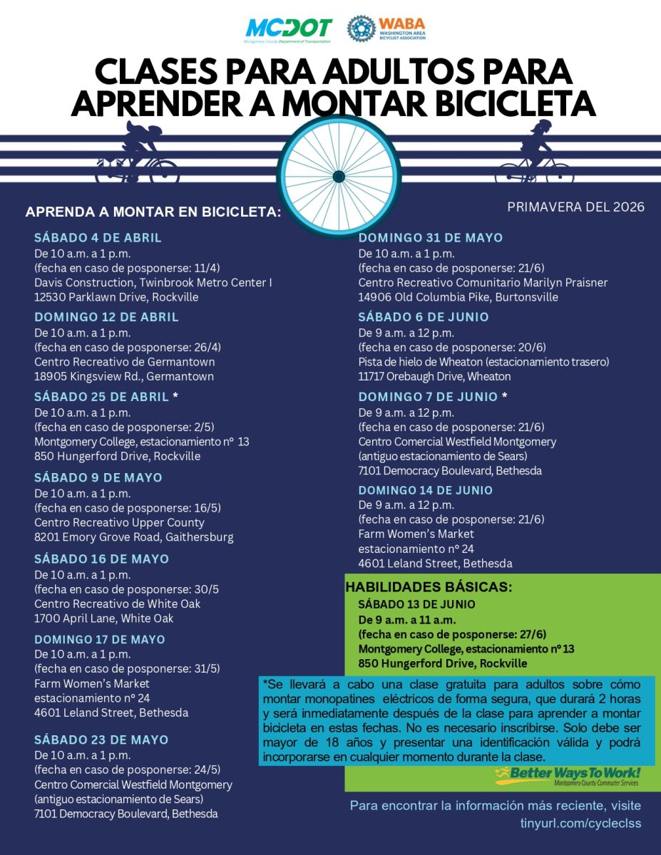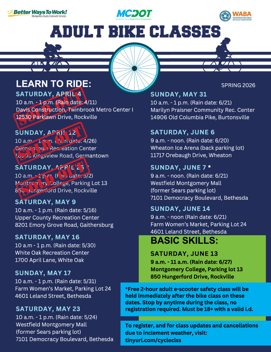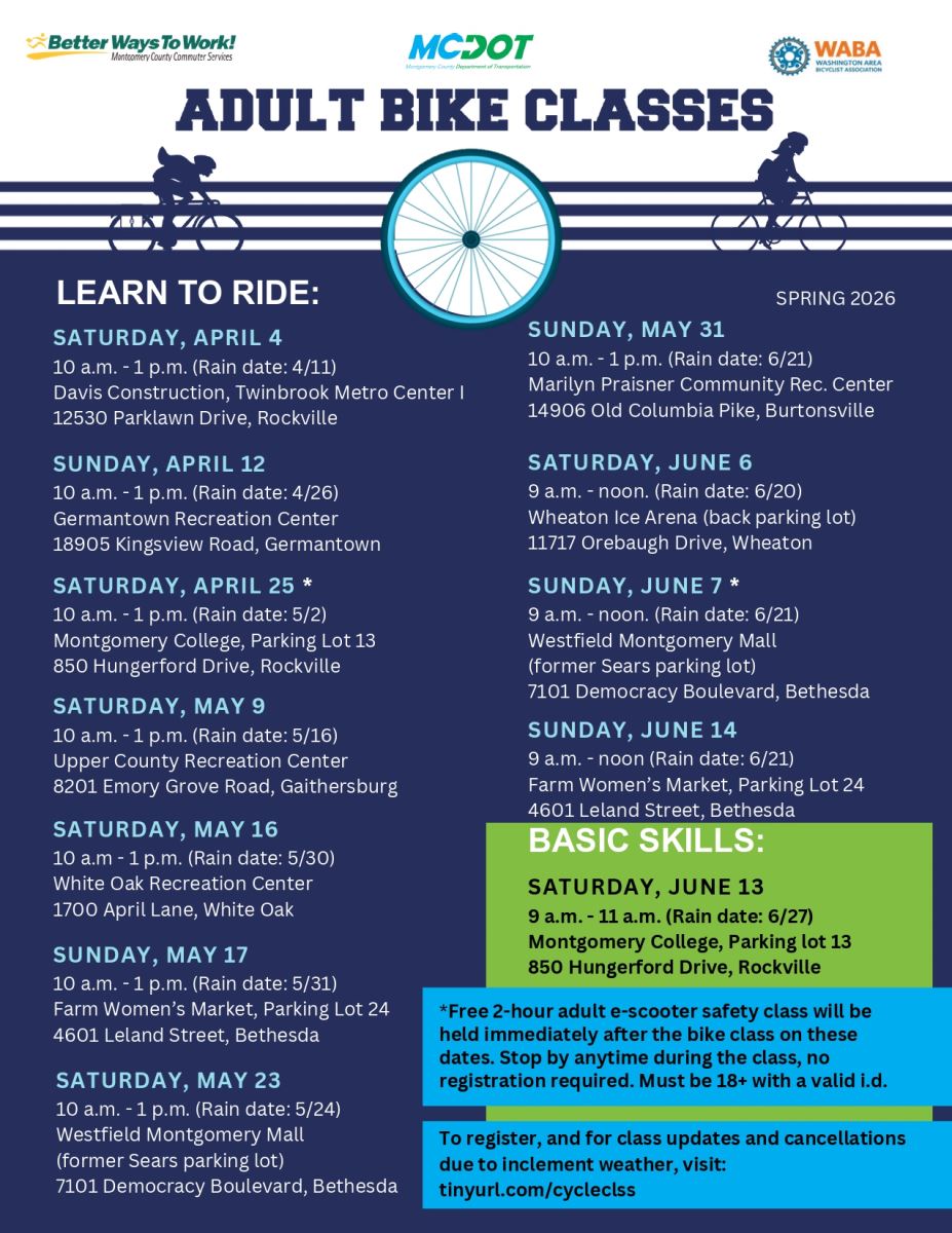 To register for the bike classes, visit: Classes « Washington Area Bicyclist Association