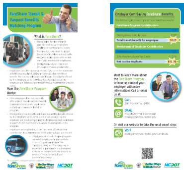 The FareShare Program encourages the use of transit and vanpooling by employees working in Montgomery County by matching employer contributions.