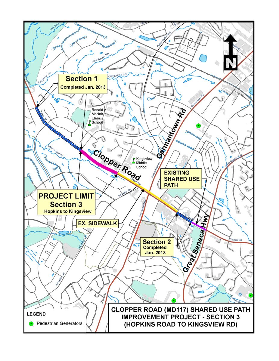 Clopper Road (Section 3) from Hopkins Road to Kingsview Road will fill in the missing link between Section 1, Section 2 and existing sidewalks and shared use paths serving the community.