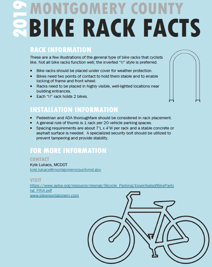 The County also offers 50.59 miles of signed shared roadway and 19.78 miles of sharrows for on-road cycling, as well as more than 284.48 miles of paved paths. MCDOT will be releasing a new online interactive map showing all of the bikeways this Fall.