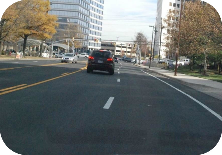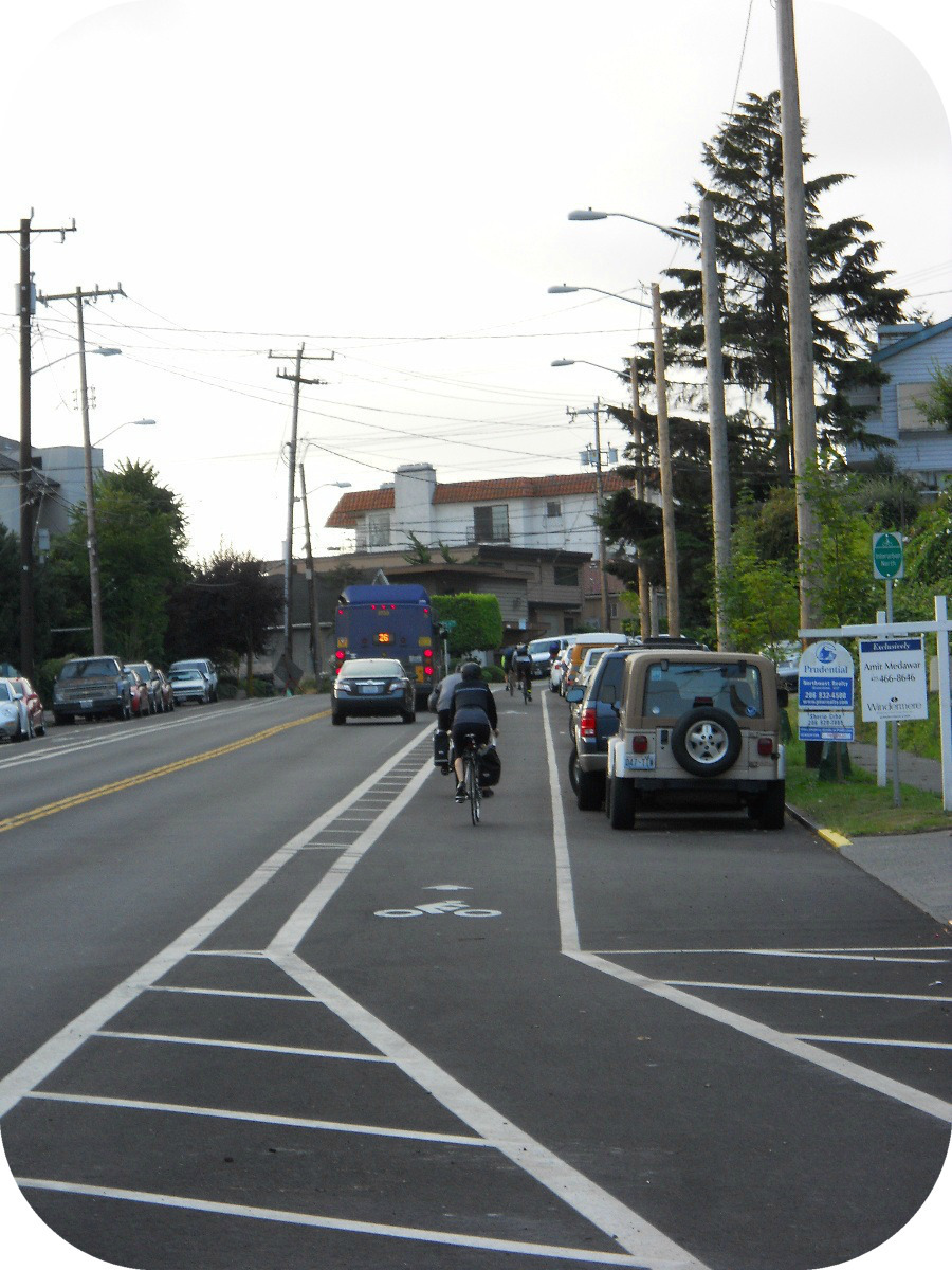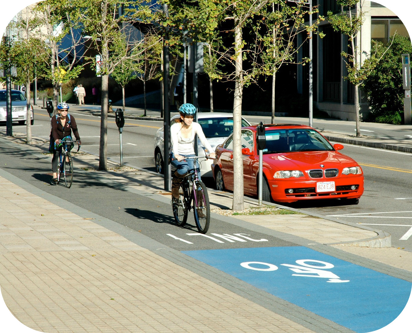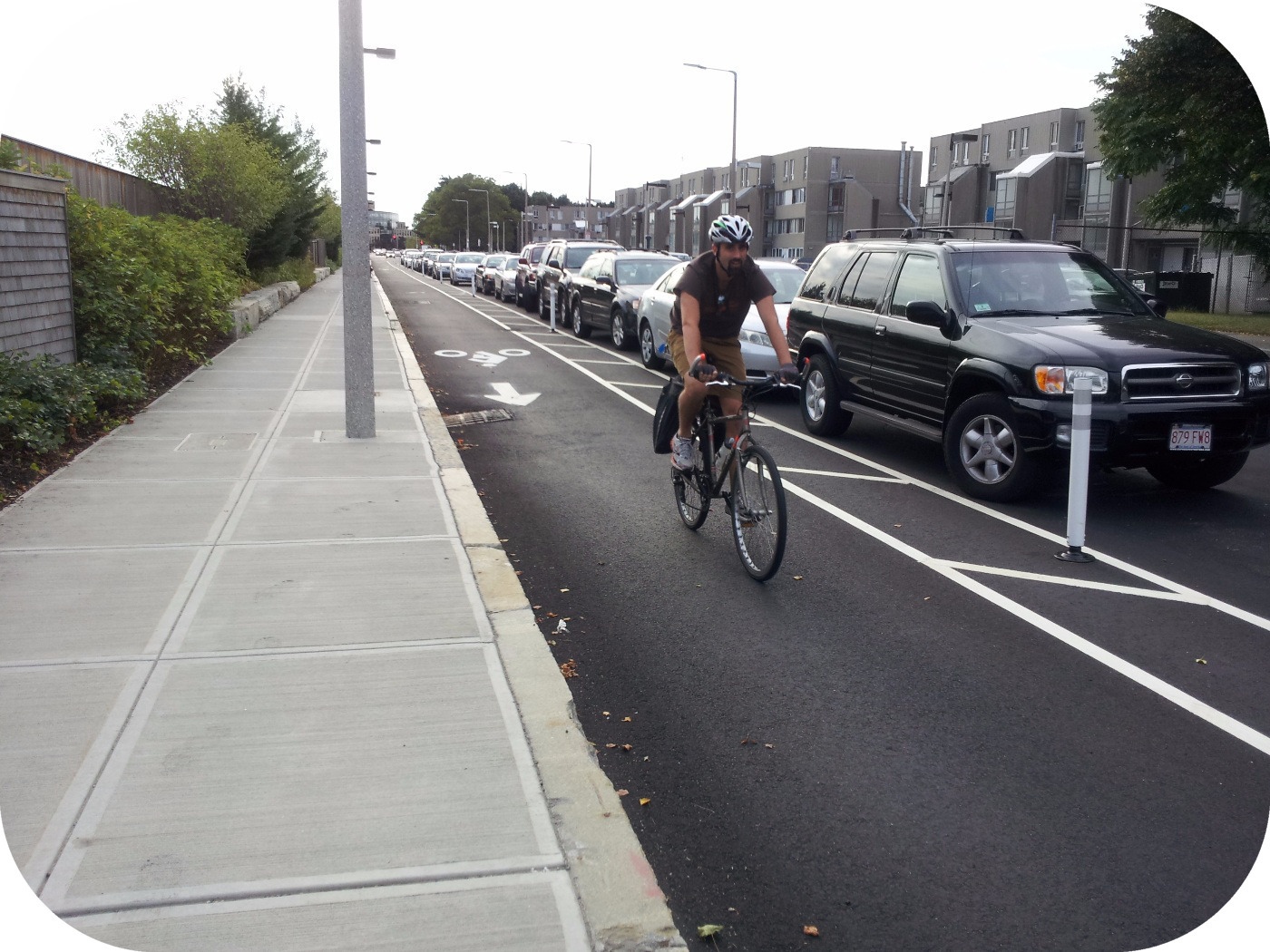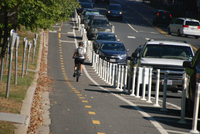 Separated bike lanes are at street level and use a variety of methods for physical protection from passing traffic. A separated bike lane may use a parking lane or other barrier between the bike lane and the motor vehicle travel lane. Benefits include a reduced risk of "dooring," preventing double-parking, reducing risks from motorists entering/existing parking spaces, and more comfortable for bicyclists of all levels and ages.