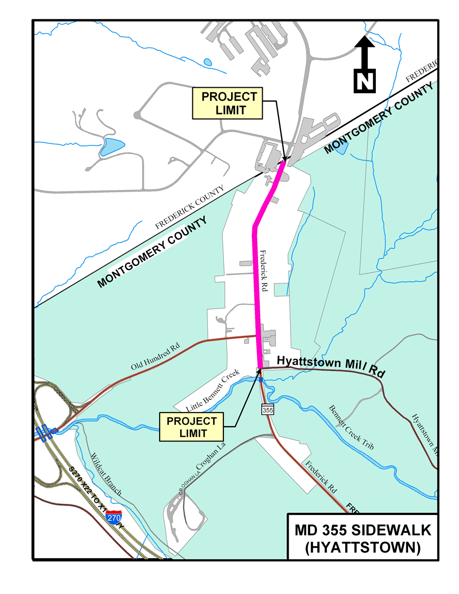Montgomery County Department of Transportation (MCDOT), Division of Transportation Engineering (DTE), will soon begin construction activities for a concrete sidewalk along the west side of MD 109 (Frederick Road) in Hyattstown. The project is about 2400 feet long from its southern limit near Little Bennett Creek to the northern limit near the Montgomery County line.