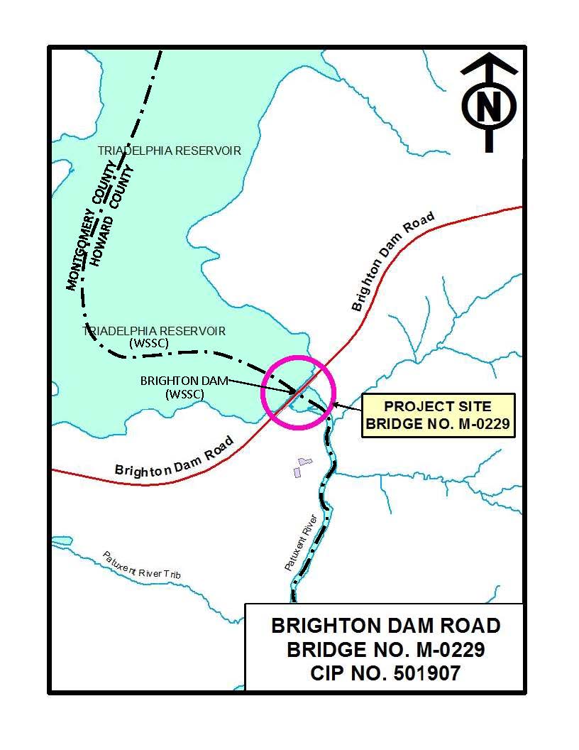 This project provides for the rehabilitation of the existing Brighton Dam Road Bridge No. M-0229 over Brighton Dam of Triadelphia Reservoir. This 602-foot long 15-span bridge, which is supported by Brighton Dam, is in need of repairs to the concrete parapets, bridge deck joints, prestressed concrete beams, concrete abutment back-walls, streetlights, asphalt approach roadways and concrete sidewalks to enhance the safety of the traveling public and the integrity of the dam. New drainage troughs will be installed on both sides of buttress nos. 11, 13, 15, 17, 19, 21, 23 and 25. The existing storm inlets on the approach roadways at both ends of the bridge will be improved as needed.