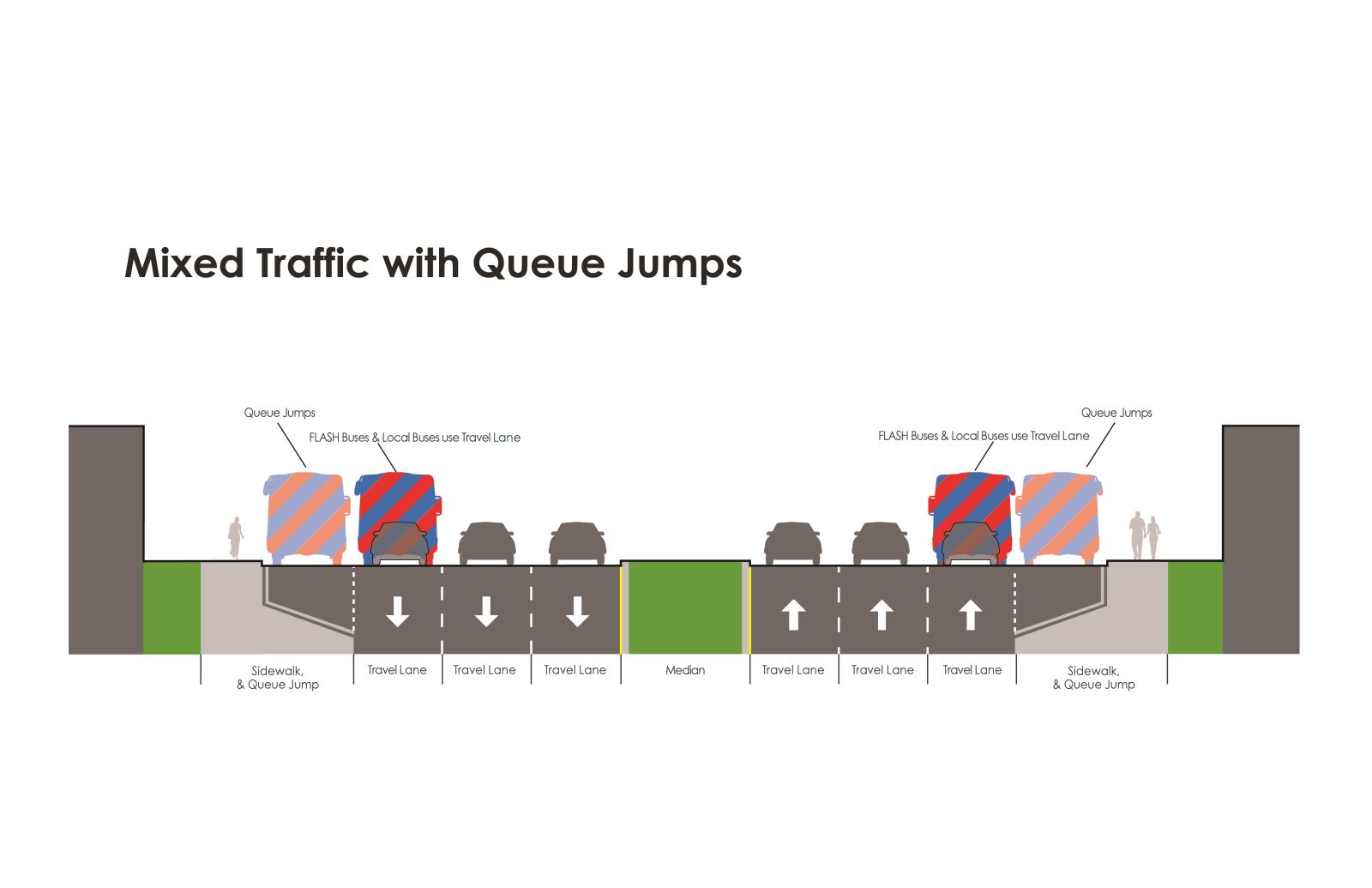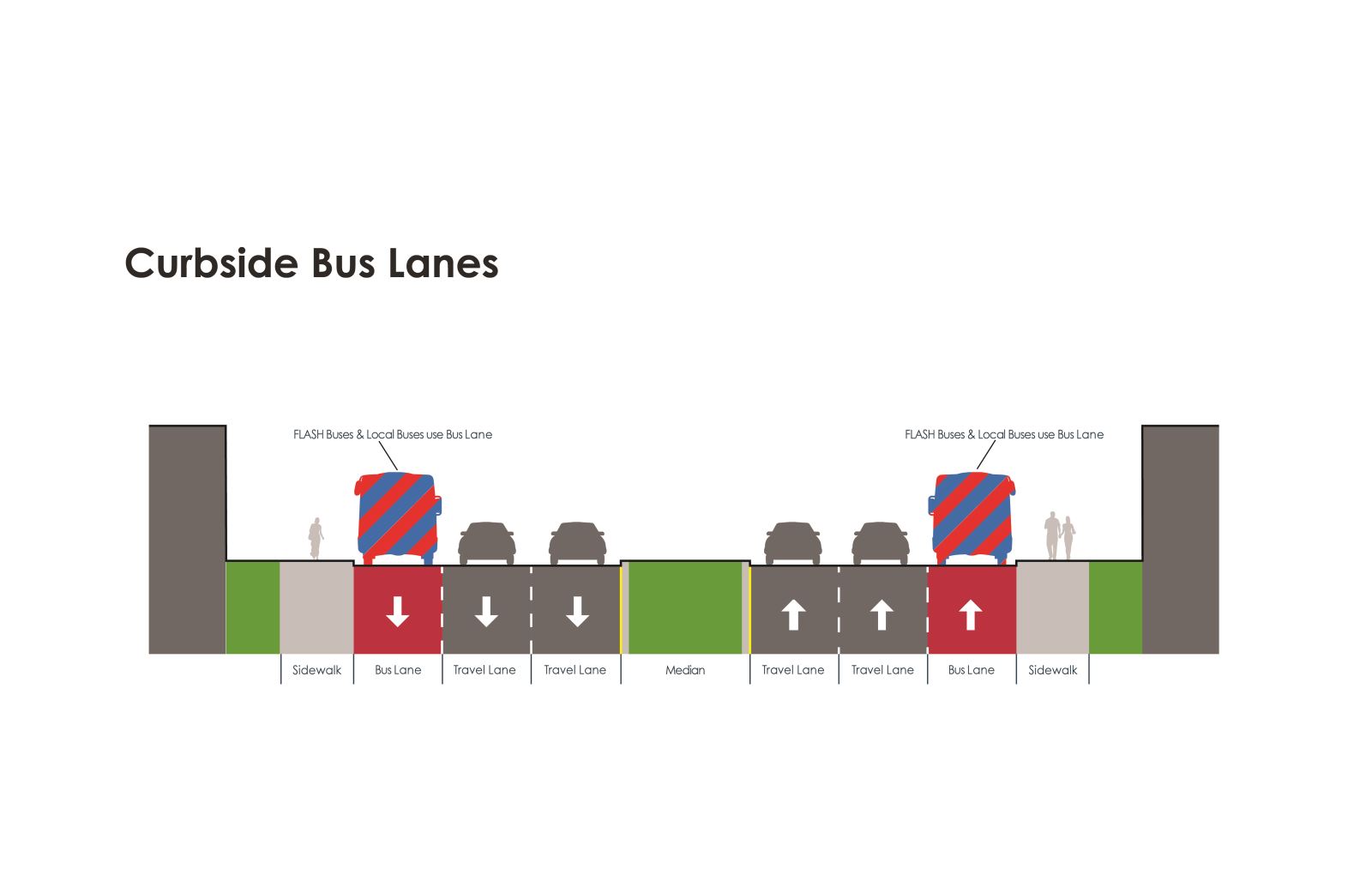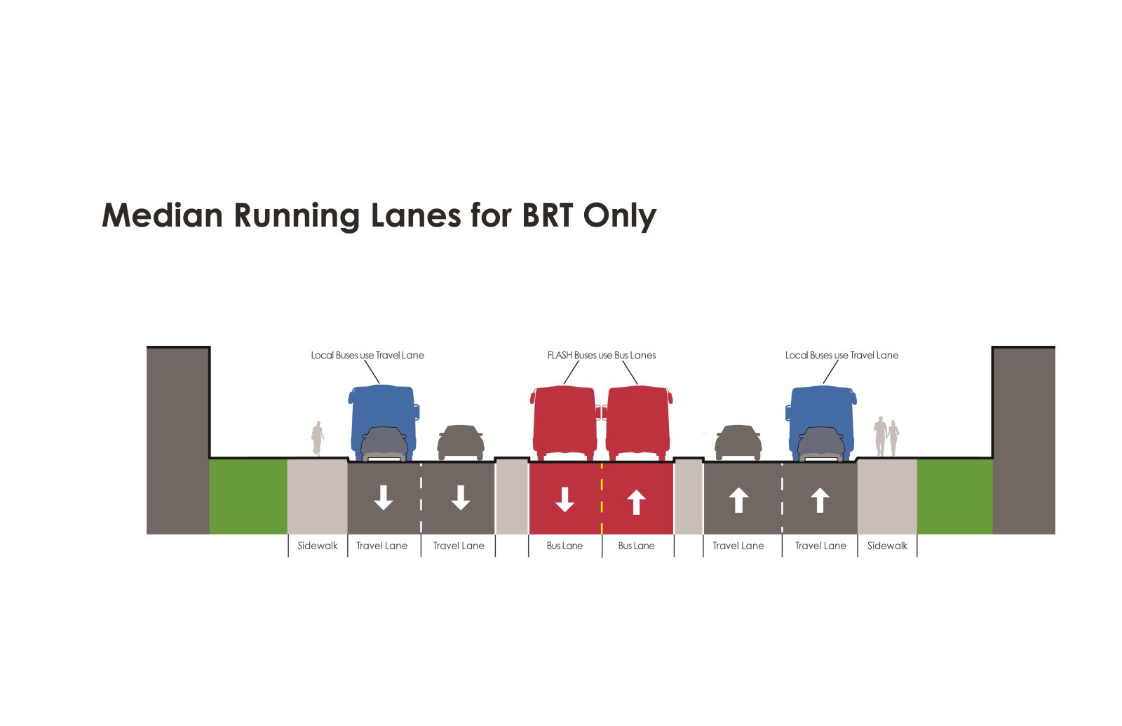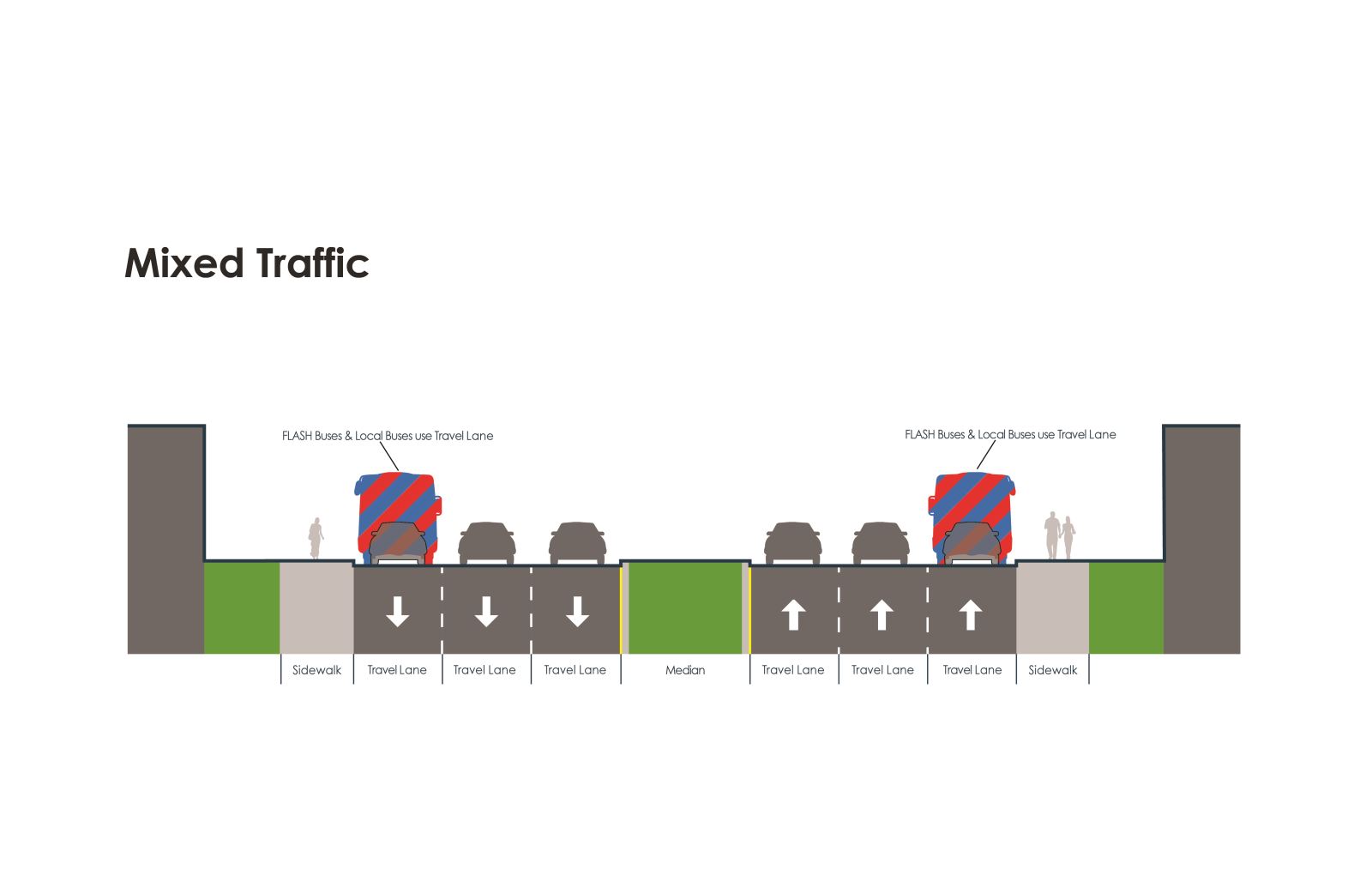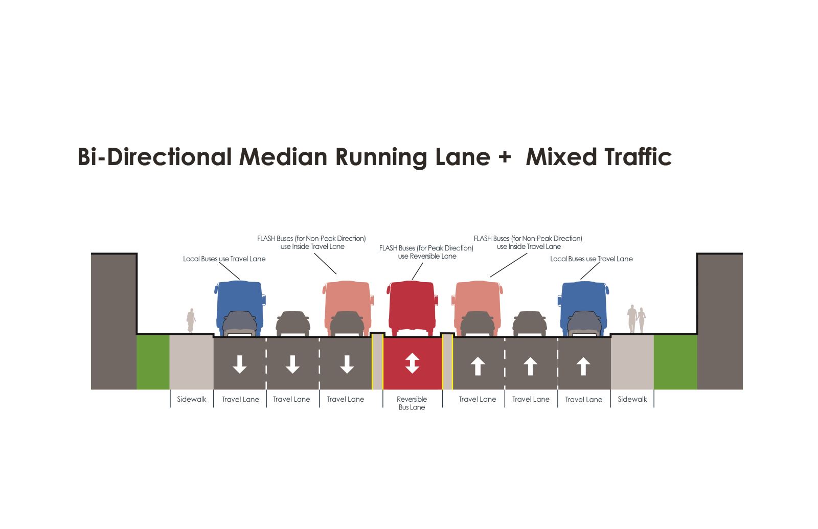 A high-cost solution which involves Flash buses using exclusive lanes in the median of the street (which are more expensive to construct). Local buses share the rest of the street with general traffic. More details are available in the Alternative 3 layout PDF.