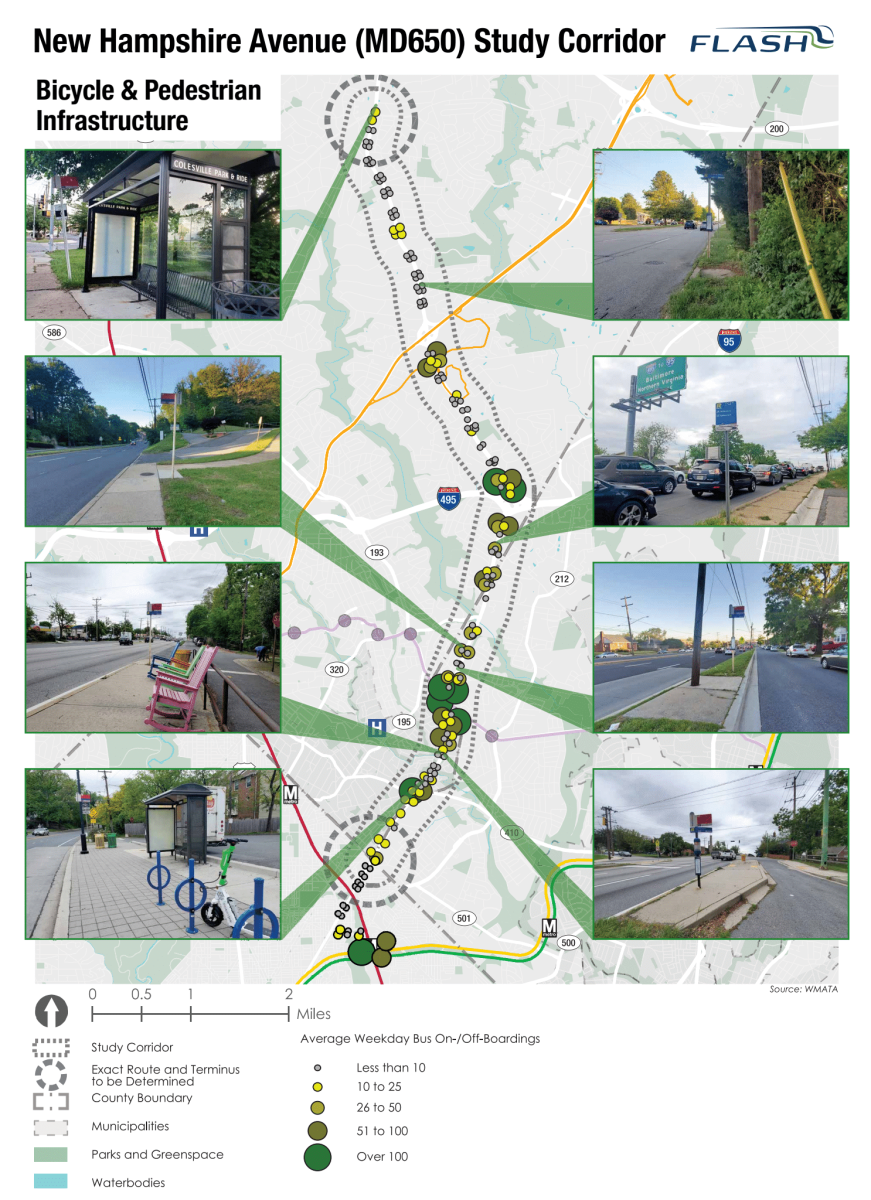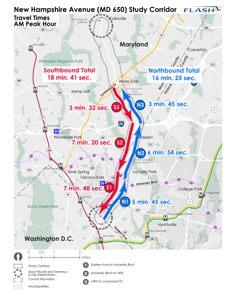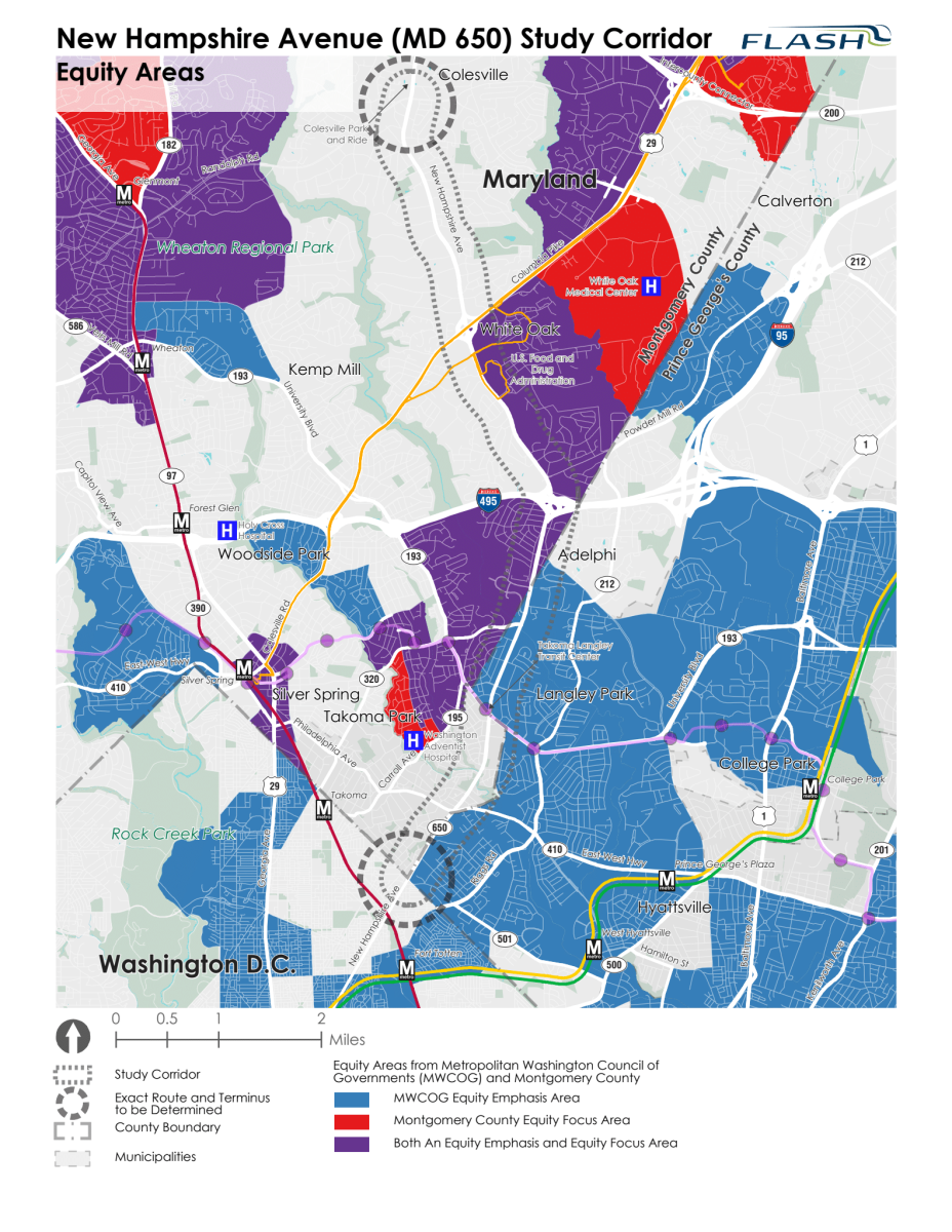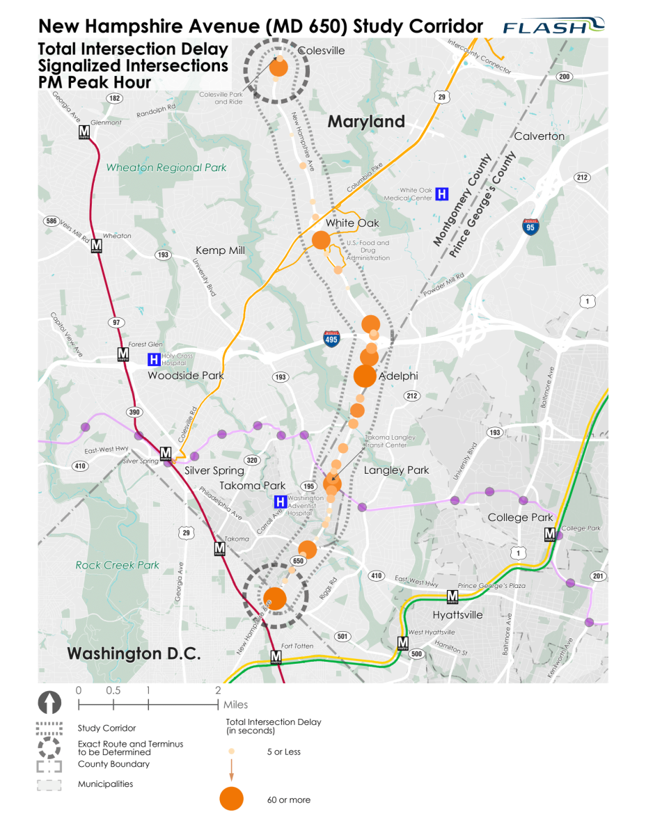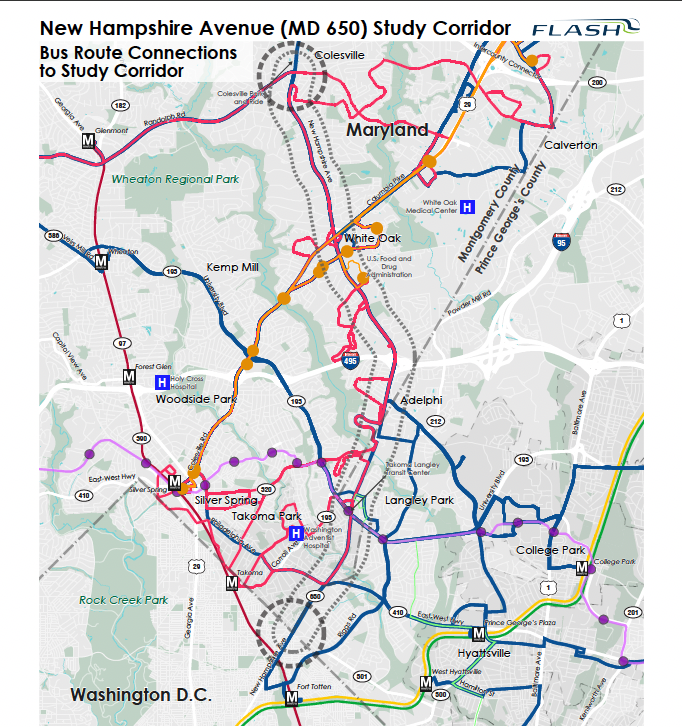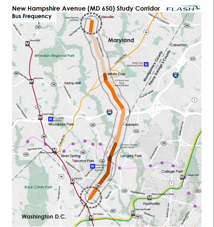 The Montgomery County Department of Transportation (MCDOT) is advancing BRT for the New Hampshire Avenue corridor consistent with the 2013 Countywide Transit Corridors Functional Master Plan. Flash will provide high quality transit service that improves the speed and reliability of bus service in the corridor.