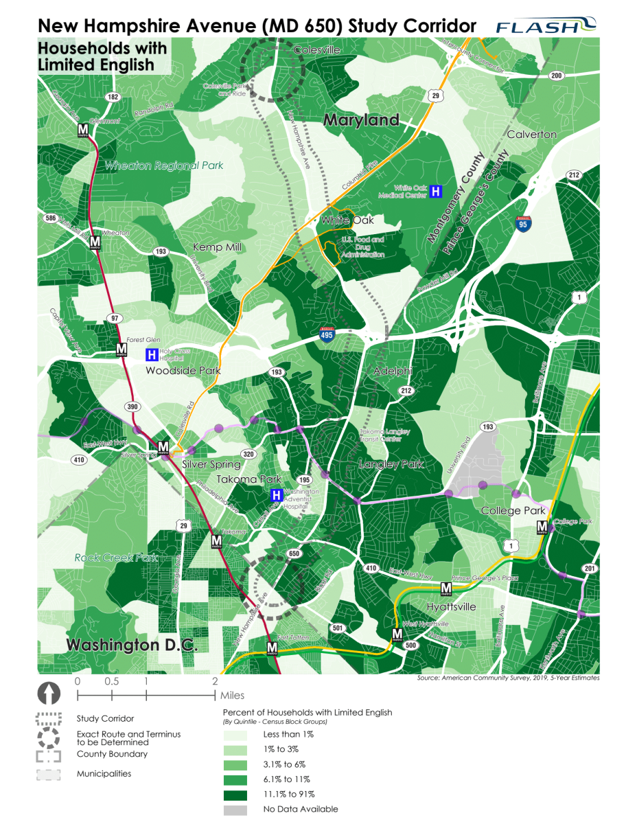 Most of the corridor is adjacent to lower income and non-English speaking areas. Many languages are spoken by corridor residents.