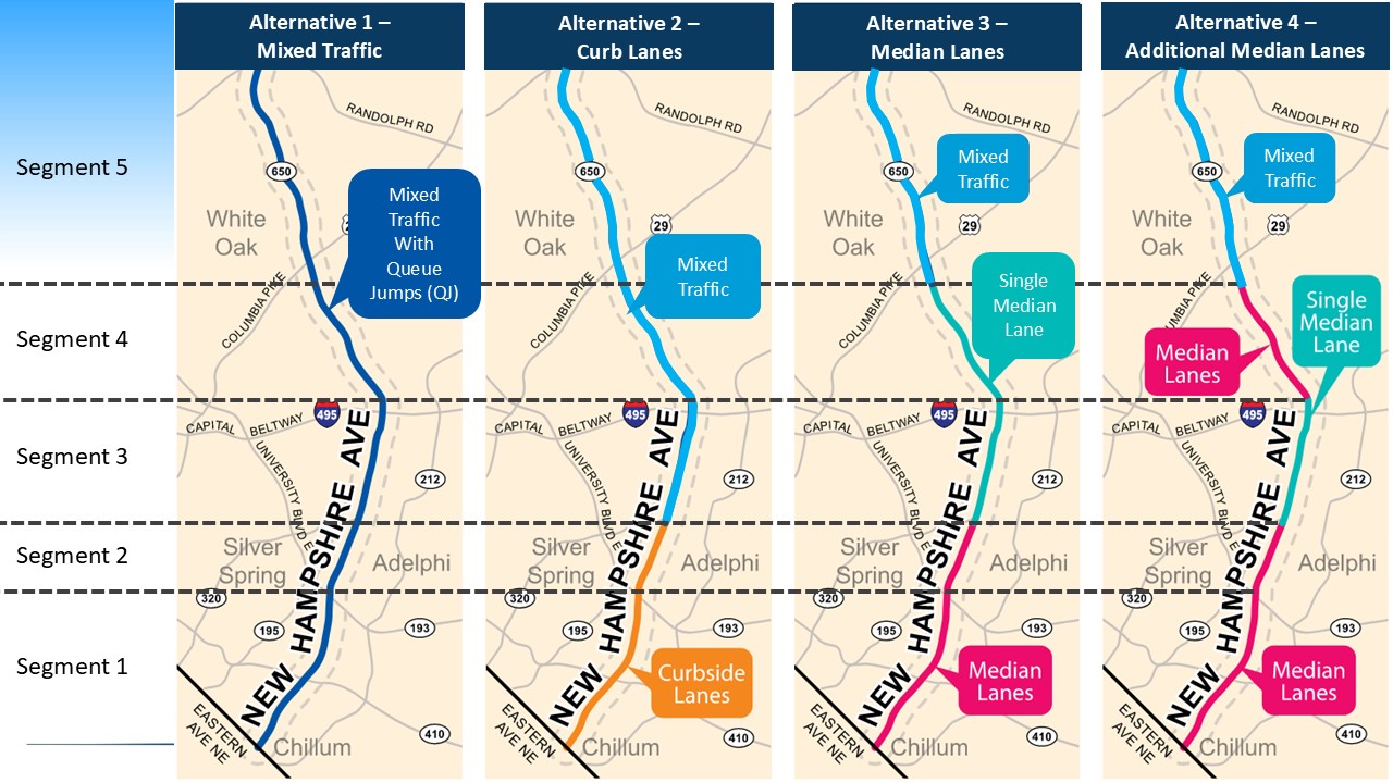 A low-cost solution involving Flash BRT buses mixing with general traffic with queue jumps on the northern portion of New Hampshire Avenue. On the southern portion, buses have their own exclusive bus lane, running alongside the curb. More details are available in the Alternative 2 layout PDF.