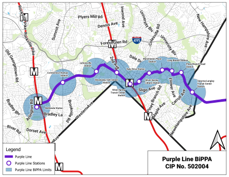 This project provides for the design and construction of high priority bicycle and pedestrian capital improvements in areas adjacent to future Purple Line Stations from Bethesda to Takoma Park within a 1/2-mile radius of each station.