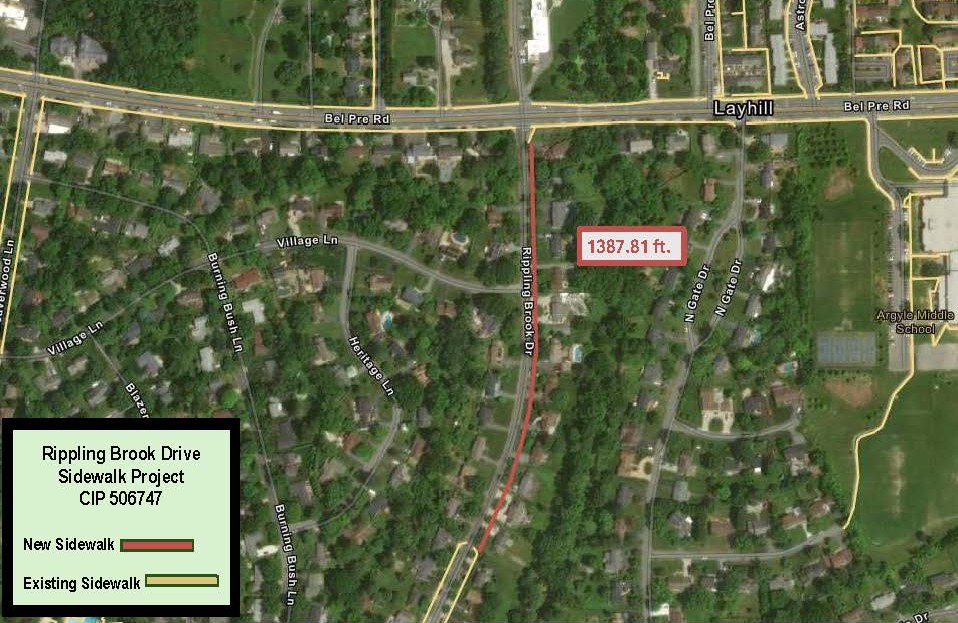 This project proposes a 5-foot-wide concrete sidewalk on the east side (odd-numbered properties) of Rippling Brook Drive from Bel Pre Road to the existing sidewalks. With a priority rating of 94.5 out of 100, this is a high-priority installation to tie existing sidewalks together and enhance pedestrian safety. Please see the Sidewalk Program’s Frequently Asked Questions (FAQ) to learn more about the Sidewalk Program and how its priority ratings are generated.