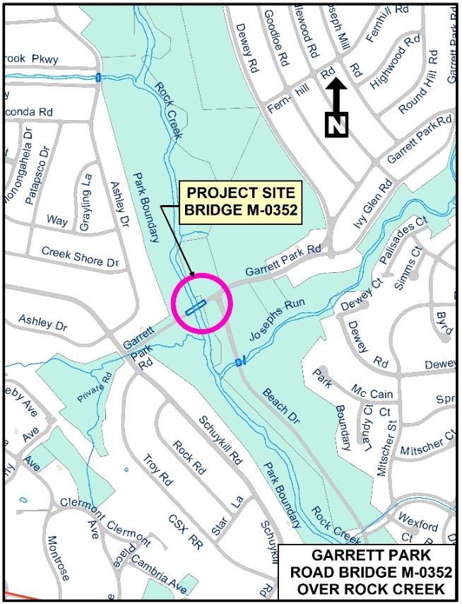 This project provides for the replacement of the existing Garrett Park Road Bridge over Rock Creek. The existing bridge, built in 1965, is a three span 154’ long steel beam with concrete deck structure. The existing clear roadway width is 24’ with a 6’ wide sidewalk on the north side of the bridge. The proposed replacement bridge includes a three span 163’ long structure consisting of five NEXT 36F pre-stressed concrete beams with a reinforced concrete deck. The new bridge will be widened to the north to provide a 32’ clear roadway width with two 11’ wide travel lanes, 5’ wide shoulders and 11’-8” wide shared-use path along the north side of the bridge.