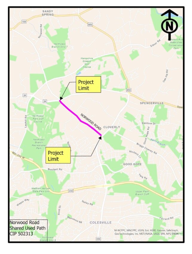The goal of this project is to build a shared-use path (SUP) on the west (southbound) side of Norwood Road, starting from New Hampshire Avenue (MD 650) and ending about 600 feet north of Eubie Blake. The total length of the path will be about 6,300 linear feet. The path will have a width of 10 feet in most places and 8 feet where there are obstacles. A grass buffer of 2 to 6 feet will separate the existing curb and the shared-use path where feasible. Some parts of the existing Norwood Road shoulder will be modified to reduce impacts to the businesses and property owners.
