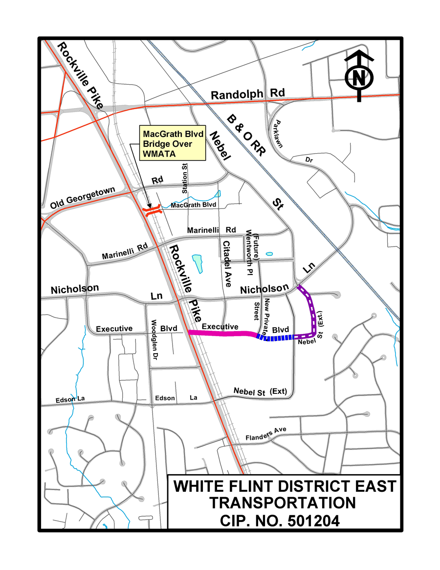 The White Flint East project provides for final design and construction for a new road to extend Executive Boulevard east from Rockville Pike (MD 355) to Nicholson Lane. The proposed road includes four lanes with sidewalk, street lighting, landscape and stormwater management. The road portion that connects Nicholson Lane and proposed White Flint Lane will have a separate bicycle accommodation on one side. The road is proposed in three phases. The first phase is Executive Boulevard Extended (B-7) from MD 355 to a new private street. The second phase is Executive Boulevard Extended (B-7) from a new private street to new White Flint Lane. The third phase is Nebel Street Extended (B-5) from White Flint Lane to Nicholson Lane. Also included in the project is a bridge over the White Flint Metro station along proposed McGrath Boulevard from MD 355 to future Station Street.