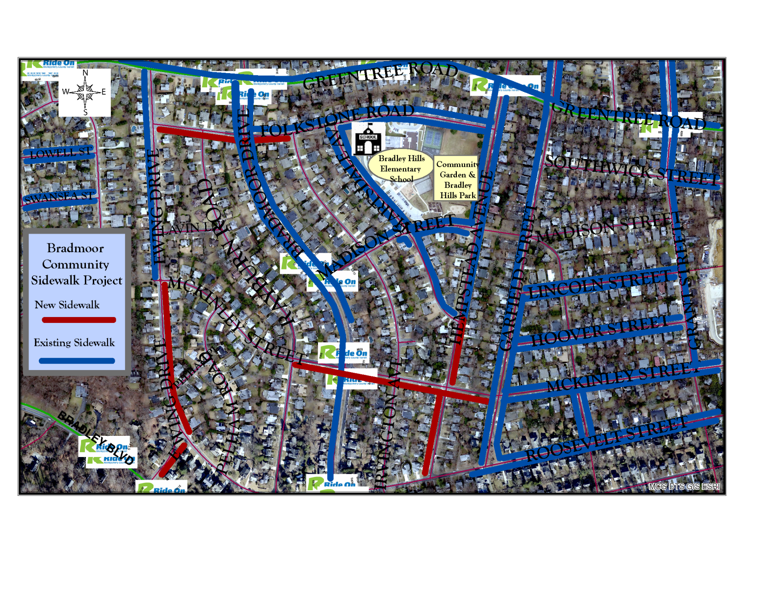 Under the Bradmoor Community Sidewalk Project, the installation of 5-foot-wide, ADA-compliant, concrete sidewalks were proposed to residents on the following roadways in Bethesda: