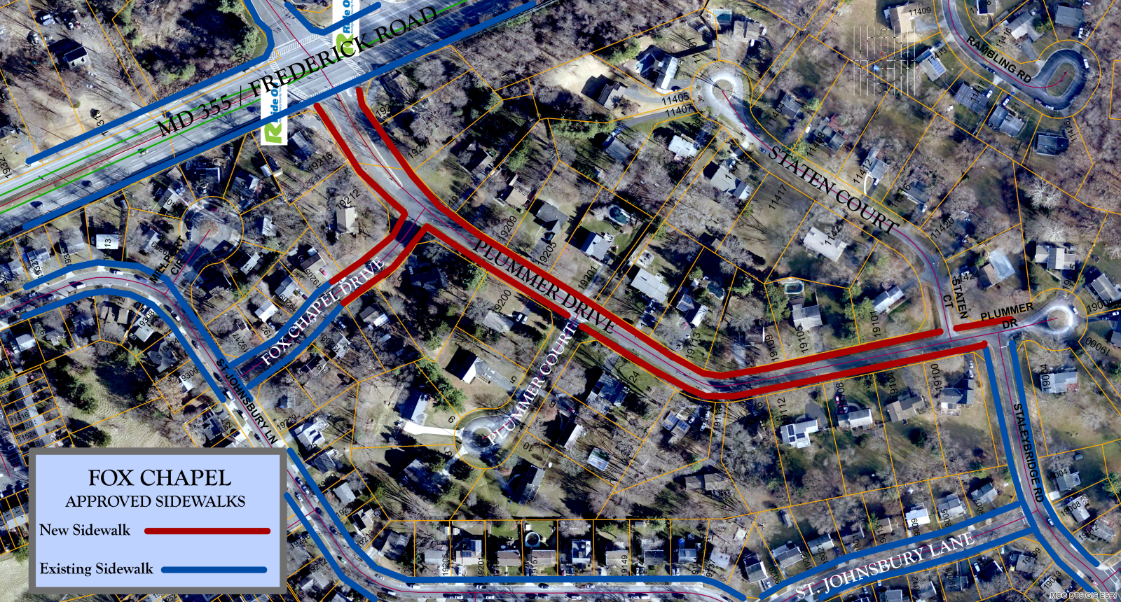 The Fox Chapel Community Sidewalk Proposal offers for examination and comment the potential installation of a 5-foot-wide, ADA-compliant, concrete sidewalk along both sides of Plummer Drive, Plummer Court and Staten Court in Germantown, Maryland.