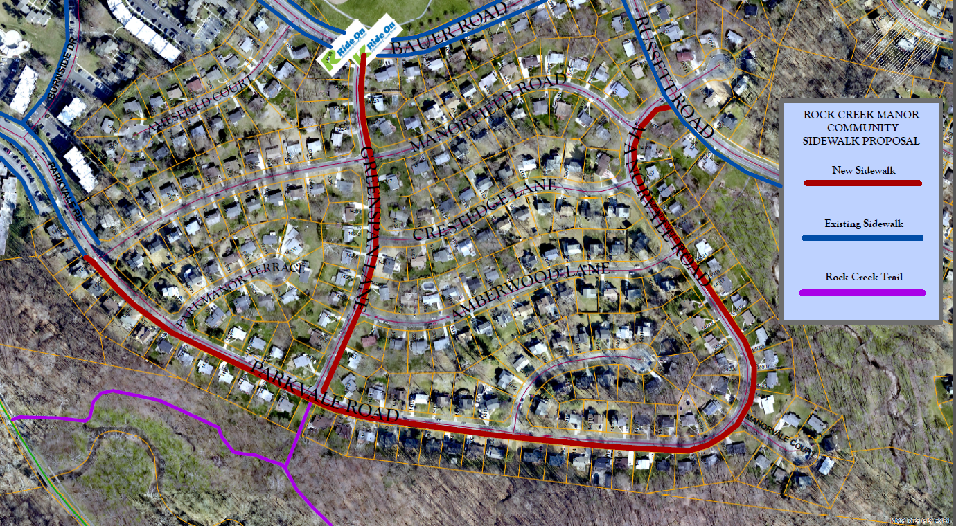 The Rock Creek Manor Community Sidewalk Proposal offers for examination and comment the potential installation of a 5-foot-wide, ADA-compliant, concrete sidewalk along the following roadways in Rockville, Maryland: