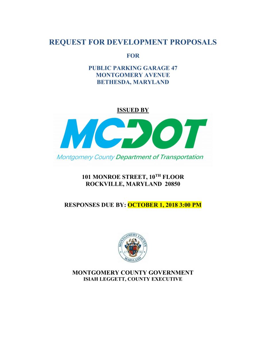 Montgomery County, Maryland (“County”) through the County’s Department of Transportation (“DOT”), seeks creative, viable proposals from qualified teams for a development project at Public Parking Garage No. 47 in the Bethesda Parking Lot District. Public Parking Garage No. 47 is located in the northeast quadrant of the intersection of Montgomery Avenue and Waverly Street in Bethesda (the "Site"). The Site is made up of two parcels, totaling approximately 39,750 square feet in area. The site currently houses a 365-space public parking garage with an “air rights” connection to a second public parking garage located on the west side of Waverly Street. The air rights connection and parking garage located to the west are not a part of the “Site”. A portion of the air right structure, including structural support columns are constructed within a portion of the 39,750-square foot parcel. The total developable square foot of the eastern site is approximately 36,000 square feet and will be referred to in this RFP as the “Site.” DOT is currently only seeking development proposals for the portion of the site located to the east of Waverly Street, but would review proposals that incorporate a phased development of the entire site. The entire site is comprised of three separate components, one to the west of Waverly Street, one to the east of Waverly Street (the Site) and one air rights component over Waverly Street. The combine site is approximately 60,391 square foot.