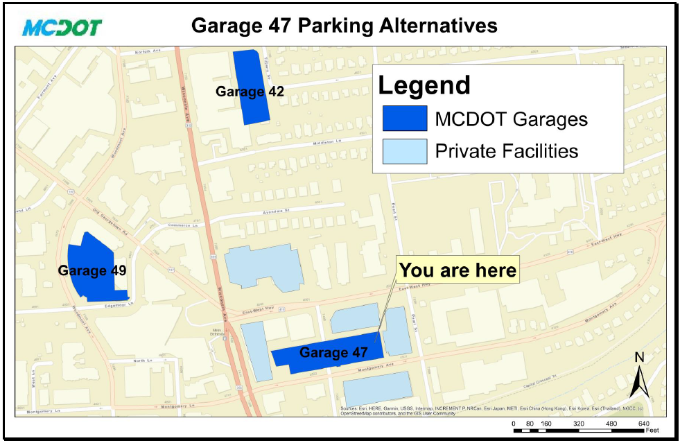 Beginning April 1, 2020, Montgomery County Department of Transportation (MCDOT), Division of Parking Management has temporarily closed portions portions of the Waverly Garage (Garage 47) in Bethesda to public use, to facilitate the construction of Garage 47 rehabilitation project. This project consists of replacing the entire garage concrete decks in all elevated levels of the garage, replacing plumbing and electrical/lighting systems in the garage. Up to 250 long-term spaces will be closed at a time in the portion of the garage east of Waverly Street.