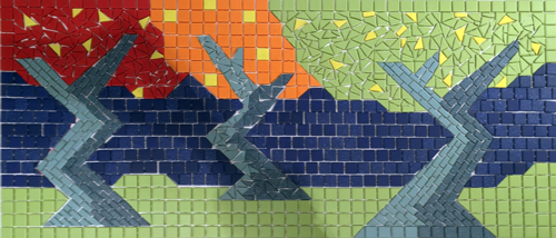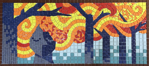 Mosaic of trees with woman's face and yellow, orange, red hair.