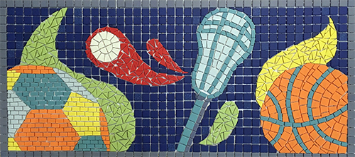 Mosaic of lacrosse stick .and ball; soccer call; basketball.