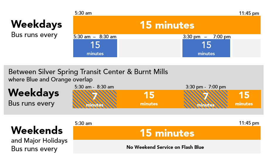 Flash is ready when you are, with vehicles arriving every 15 minutes or less. Where routes overlap, service is every 7 -8 minutes during rush hour on weekdays.