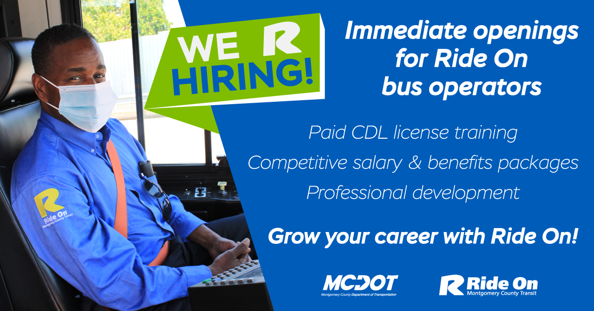 Thank you for your interest in a career with MCDOT Ride On as a Transit Bus Operator. We continuously welcome individuals who are passionate about serving the community and supporting Montgomery County’s transportation needs.