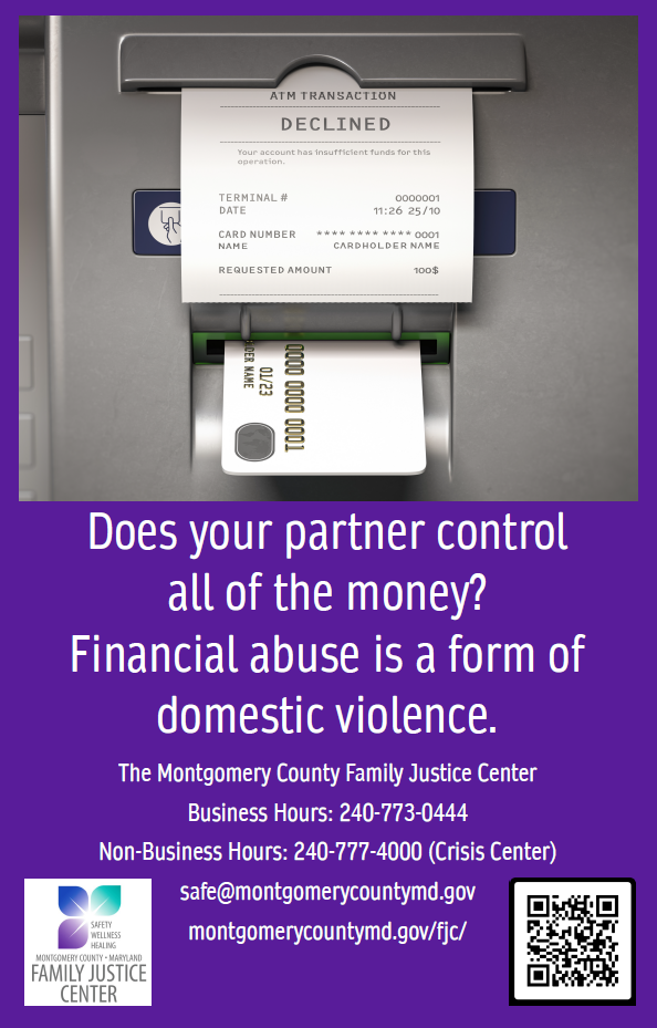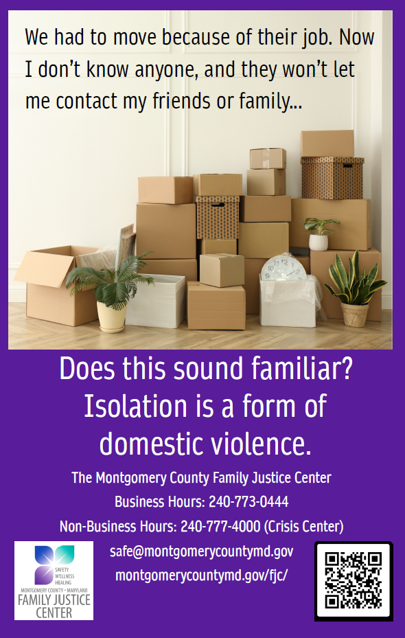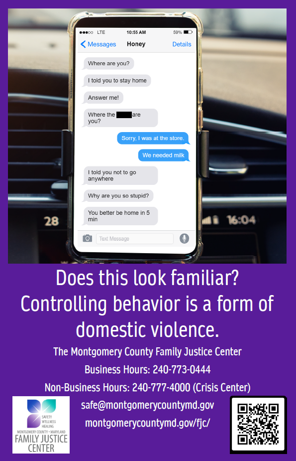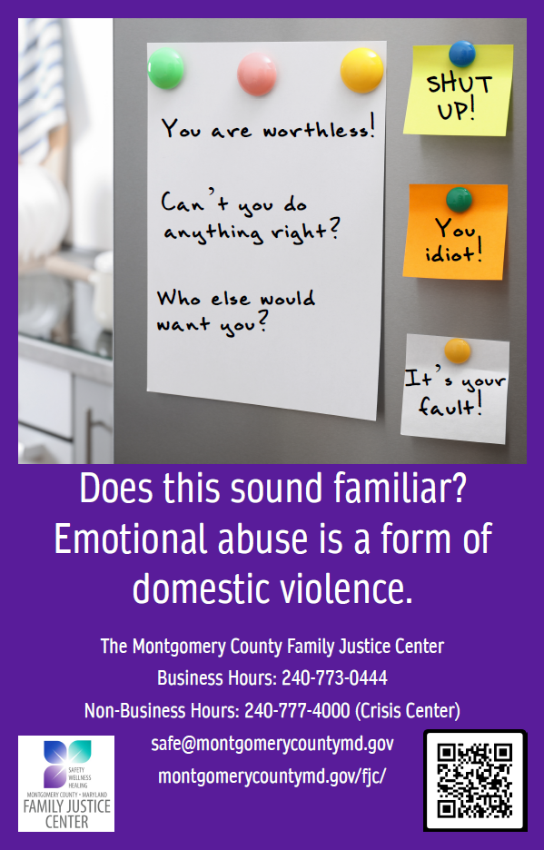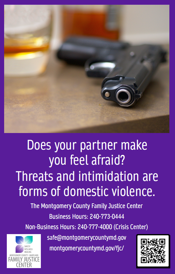 During October, the Montgomery County Domestic Violence Coordinating Council is displaying posters at Metro Stations in Montgomery County encouraging the public to learn how to help those who may be victims of domestic violence. Please wear PURPLE to show your support on Thursday, October 16th. Post on social media and tag @mocodvcc! What is domestic violence? Click below for more information about how to help victims of domestic violence. |