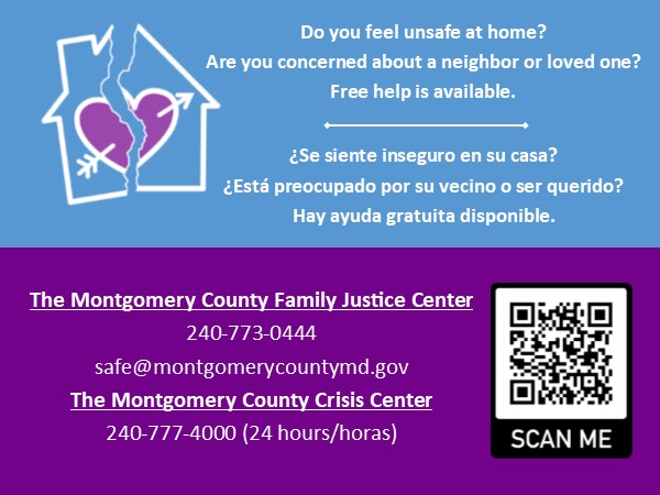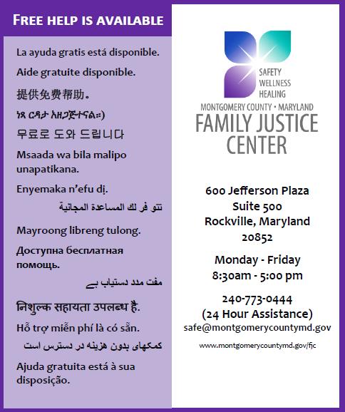 The language card states, “Are you afraid of your partner? Free help is available,” in the 16 most commonly spoken languages in Montgomery County—English, Spanish, French, Mandarin, Amharic, Korean, Swahili, Igbo, Arabic, Tagalog, Russian, Urdu, Hindi, Vietnamese, Farsi and Portuguese. They are available in 2 sizes: