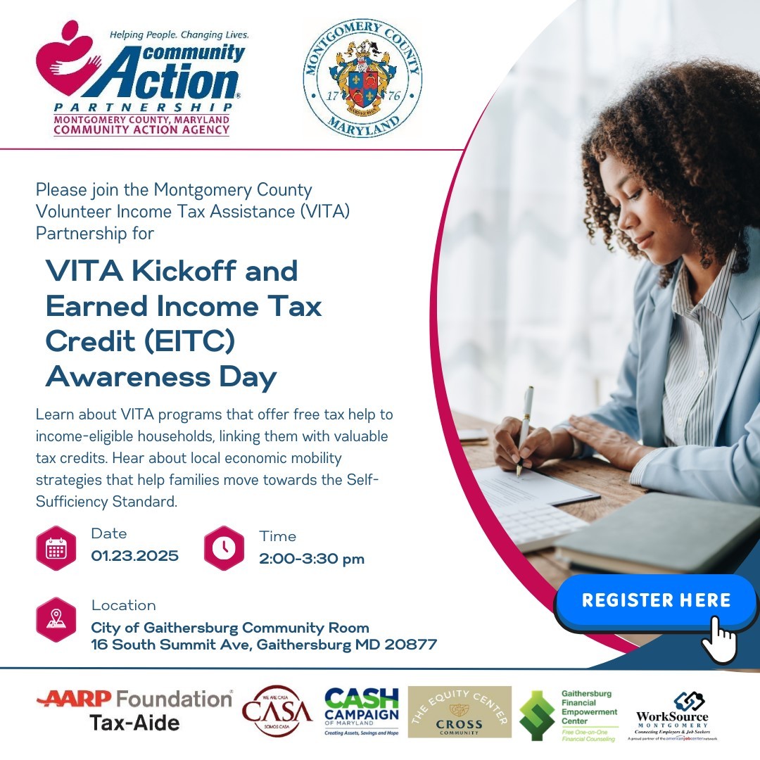 ¡El Crédito Tributario por Ingresos del Trabajo (EITC, por sus siglas en inglés) cumple 50 años este mes! Para celebrarlo, la Agencia de Acción Comunitaria del Condado de Montgomery y la Asociación de Asistencia Voluntaria para la Contribución al Impuesto sobre la Renta (VITA, por sus siglas en inglés) están organizando un Día de VITA.