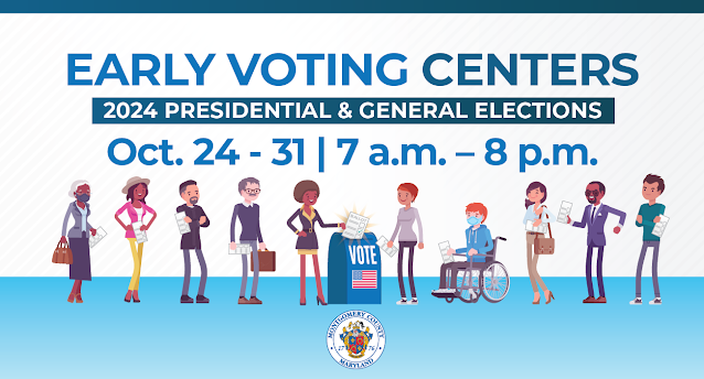 A partir de hoy, 24 de octubre, hasta el jueves 31 de octubre, los electores registrados pueden votar en persona en cualquiera de los 14 centros de votación anticipada del Condado de Montgomery. Todos los sitios sen encuentran abiertos todos los días, incluyendo sábados y domingos, de 7 a.m. a 8 p.m. RideOn y Metrobus también tienen varias rutas disponibles para transportar a los electores a los centros de votación anticipada.