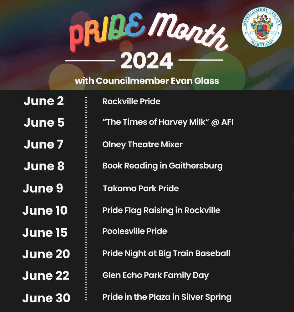Join Councilmember Evan Glass, County Executive Marc Elrich, and leaders in Montgomery County for the County’s sixth annual Pride Flag Raising in Rockville.