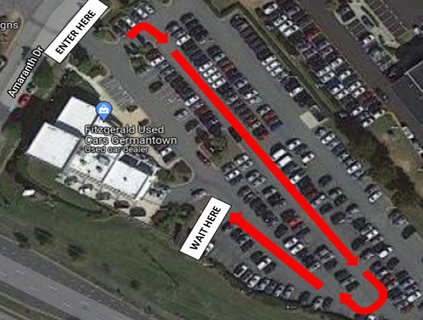 The appointment will be located at Fitzgerald Germantown Car Dealership at 19501 Amaranth Drive, Germantown, MD 20874. The building is located at the corner of Amaranth Drive and Middlebrook Road. Appointments are held by the garage bays. Enter the parking lot on Amaranth Drive and follow the signs through the parking lot. Please wait at the sign before the driveway to the garage bays. Please do not drive up the driveway. A technician will come get you when ready to receive you for your appointment. See map below.