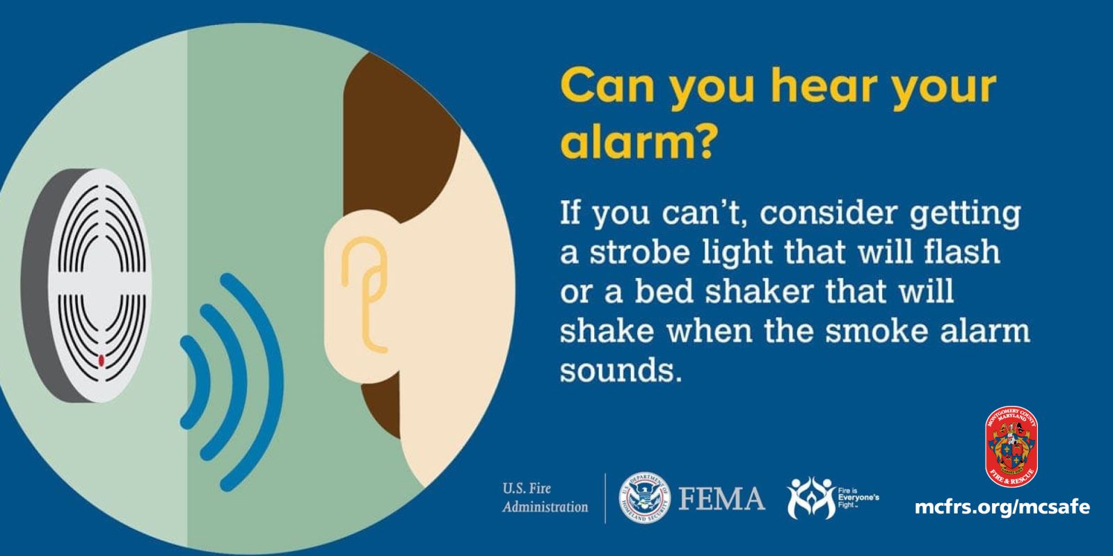 One of the most significant advances designed to address the fire safety needs of the deaf and hard of hearing community is the audible smoke alarm. These specialized alarms are available to Montgomery County residents. The Montgomery County Fire and Rescue Service and the United States Fire Administration (USFA) have teamed up to provide the following important information: