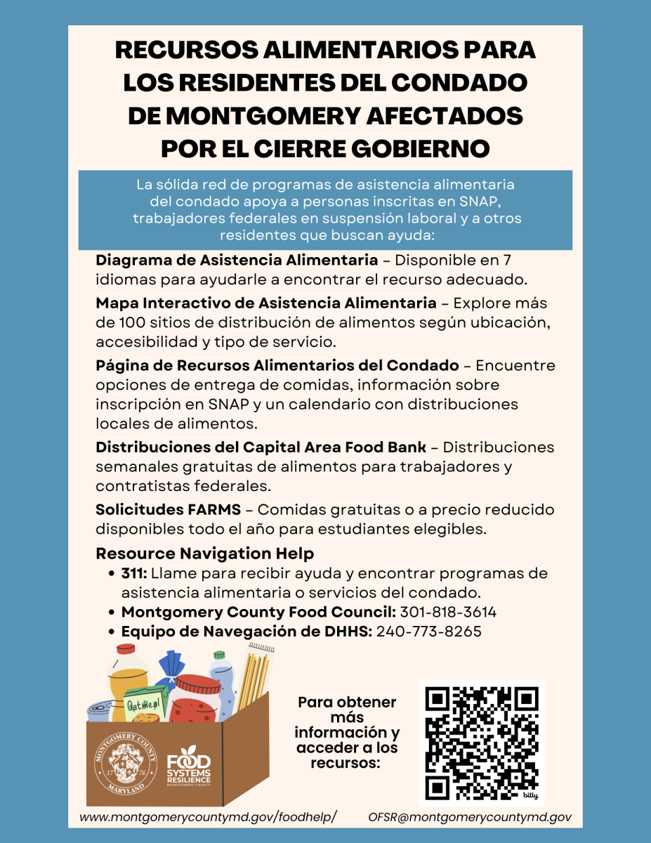 - Montgomery County Food Council Food Resource Specialists: 301 818-3614